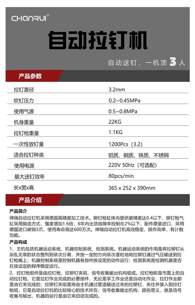 禅瑞自动抽芯铆钉机采用德国高精度加工技术。铆钉枪缸体内壁研磨精度达0.4以下,铆钉枪气缸采用锻造方式,强度增加1.6倍,6年内出货故障率控制在2%以下,配件采用德国进口碳钢3爪,使用寿命高达600万次。高效稳定,操作简单,有计数功能。