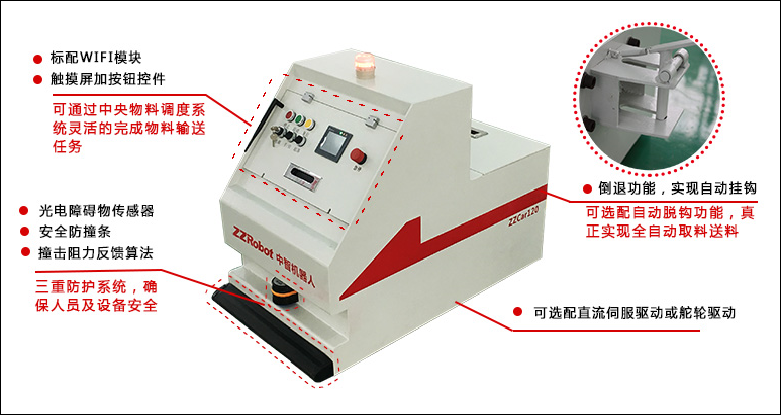 1) 尾部牵引AGV小车行驶方向上安装有红外障碍物传感器、安全触边及前端急停三重安全保护措施。