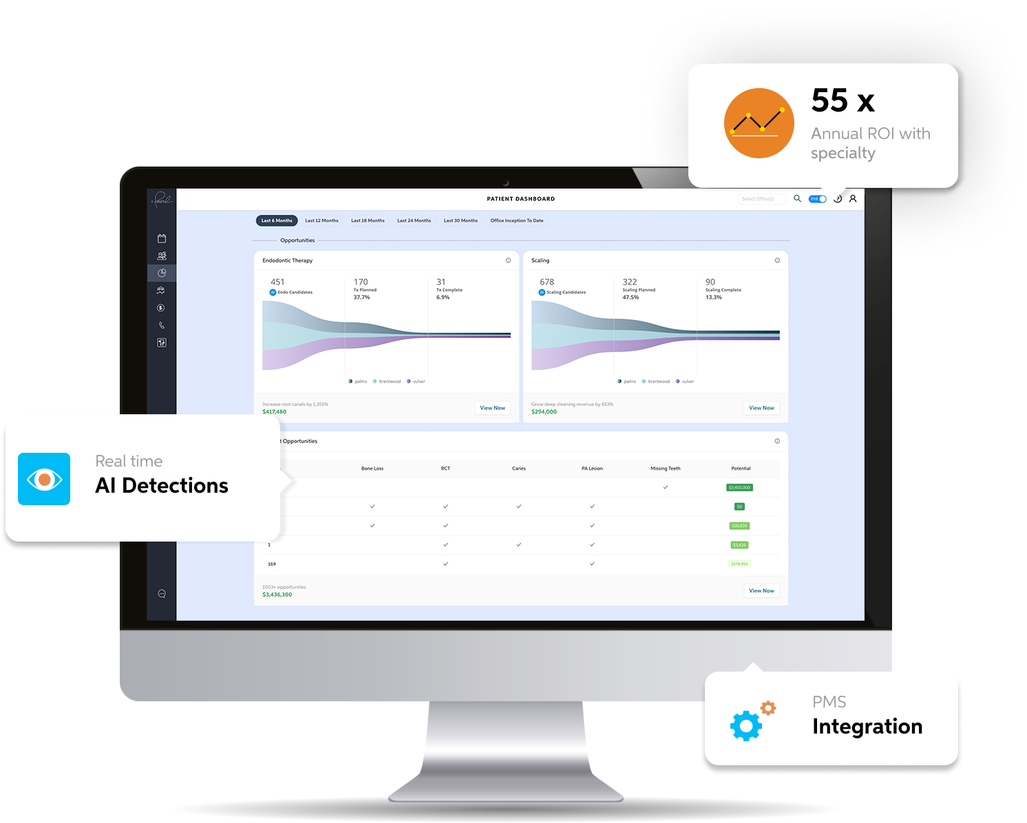 通过收集第二意见检测到的患者X光片和来自实践管理系统的治疗数据的证据,实践智能为办公室工作人员提供X射线视力到实践表现中。
