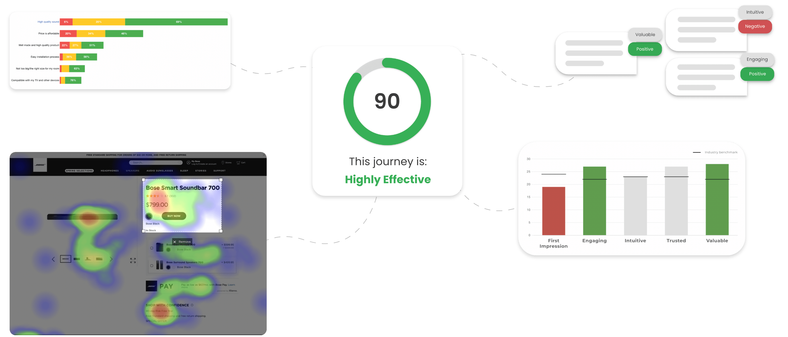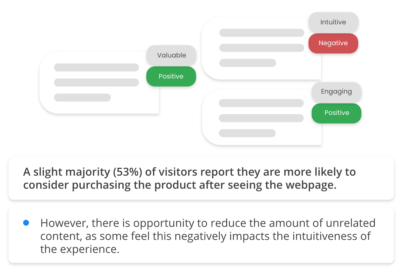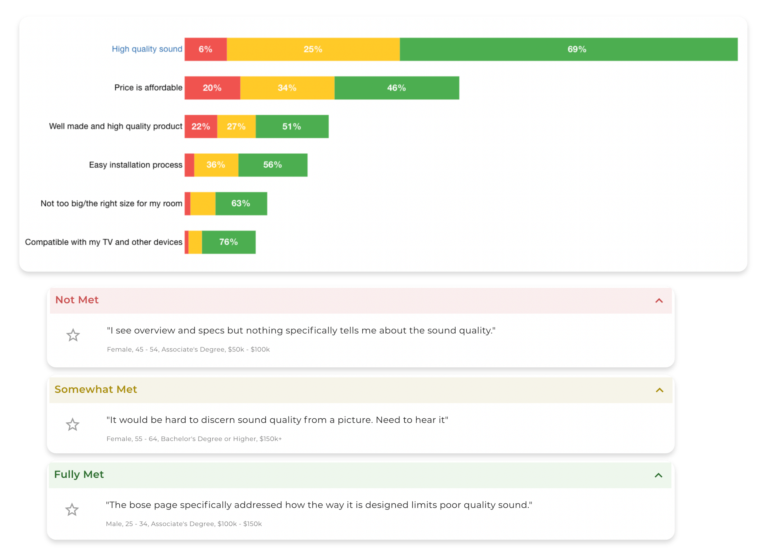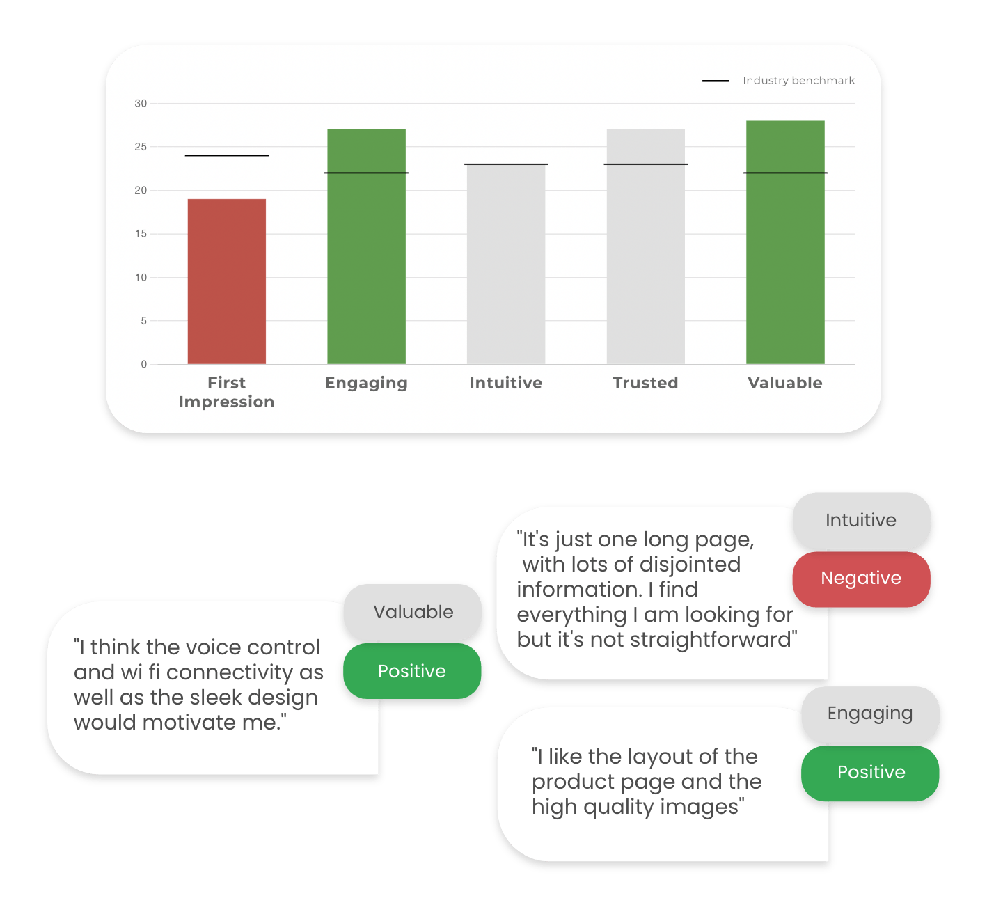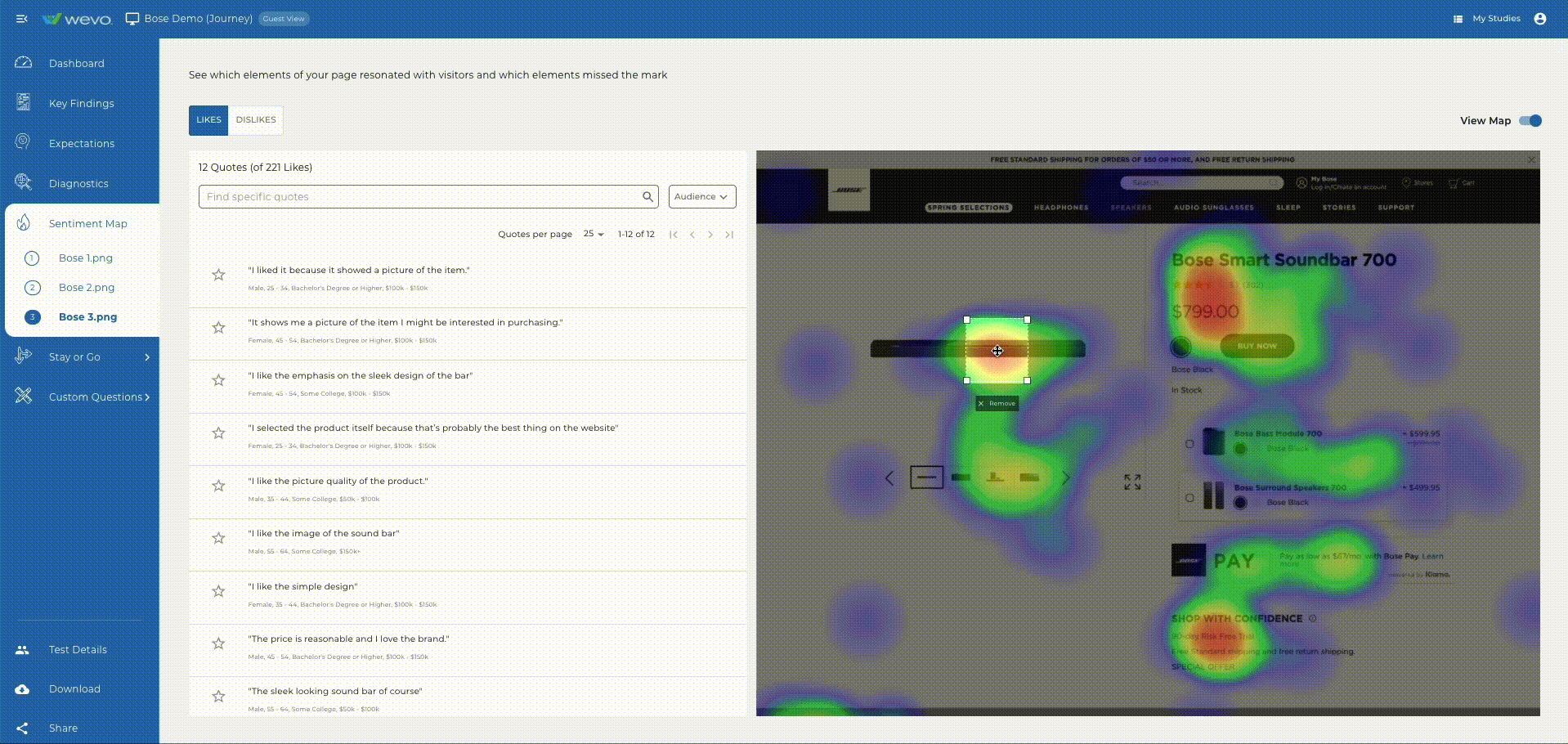 了解哪些元素获得最多的正面和负面反应。突出显示一个部分以查看用户的真实报价。