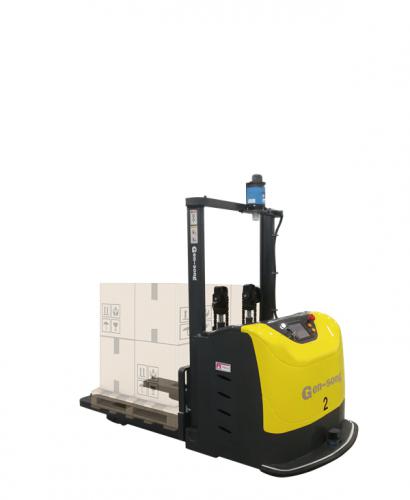 托盘式堆高车AGV是与托盘式堆高叉车功能相近的一款AGV。托盘式堆高车前有底腿,叉齿间距固定,结构简单安全,其经济型比较好。比较适用于国标单面托盘的货物装卸转运。