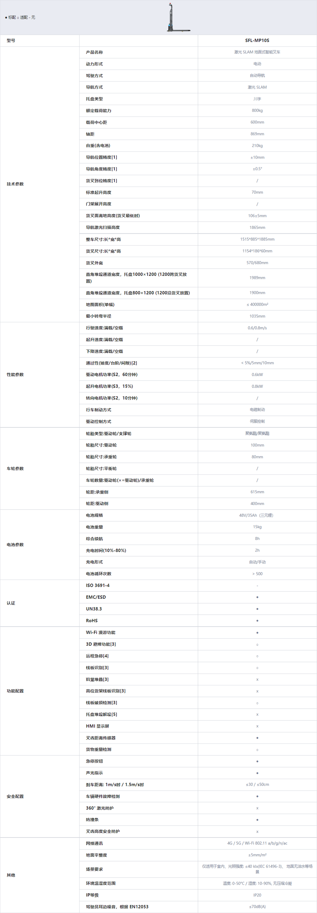 基于 SRC 的激光 SLAM 地面式智能叉车 2021 款 SFL-MP10S 在第二代基础上做了多项改进,外形小巧,负载能力超强;内部搭载 SRC 系列核心控制器,实现了 ±10mm 的高精准定位;并且配合红外传感器、3D 避障、安全触边等多种传感器进行安全防护,能够保证智能叉车在作业过程中人员和货物的安全,可灵活完成狭窄空间内的货物运输,是实现工厂智能物流的“搬运神器”。