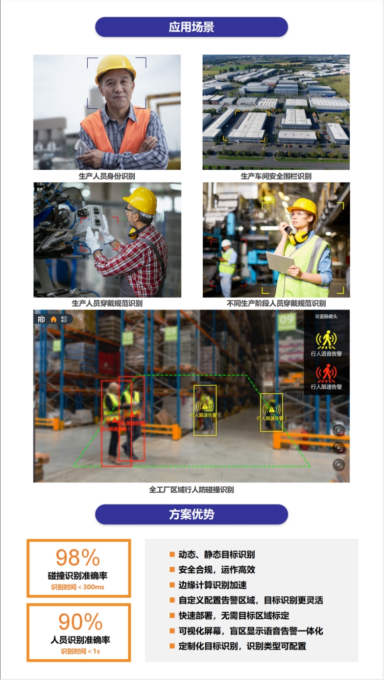 方案基于人工智能模式识别算法,对工厂全区域安全情况进行实时监测,实现防撞识别、人员识别两大核心功能。对工人的身份、着装以及操作情况、区域内碰撞风险进行全方位、全时段的智能监测及自动预警,保证工厂安全。