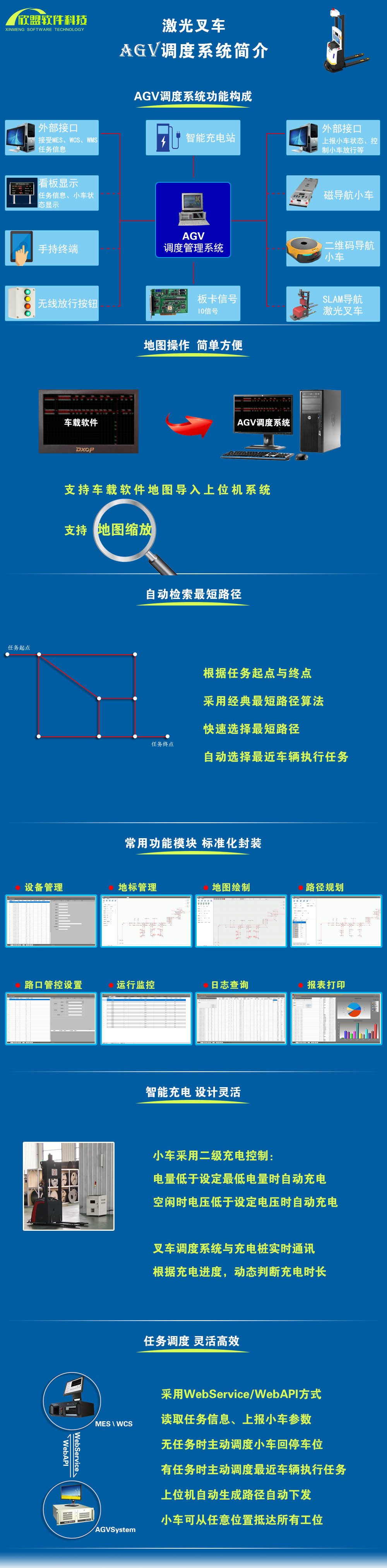 激光叉车智能AGV调度系统简介:上位机系统具有地图绘制及自动导入功能、地标管理、交通路口管控、路径规划、最短路径搜索、上位机路径下发功能,支持地图缩放,WCS WMS任务获取接口