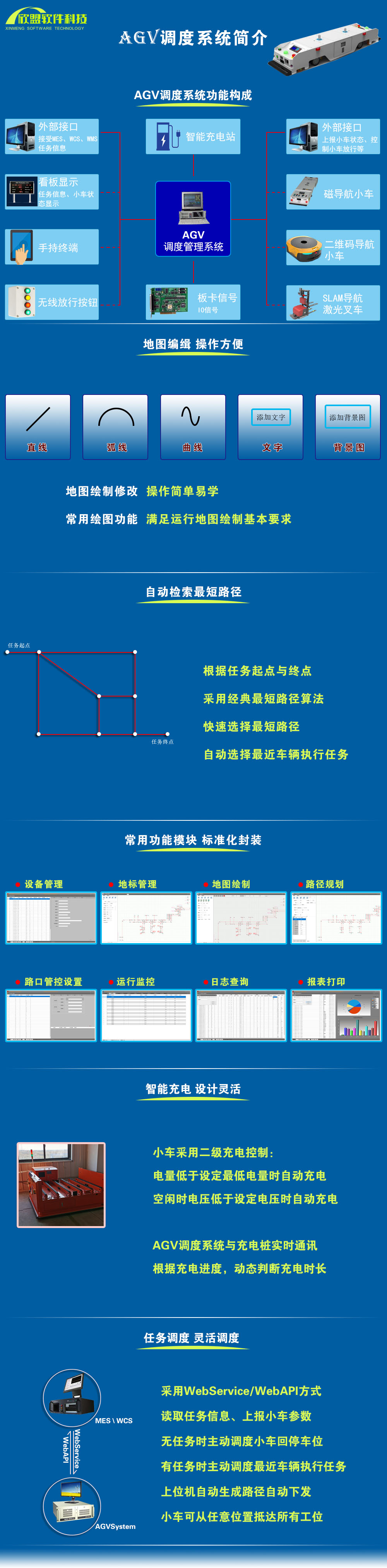 智能AGV调度管理系统上位机具备设备管理、地图绘制、地标管理、交通路口管控、路径规划、最短路径搜索功能、上位机路径下发、WMS任务获取接口、任务读取分配与执行......