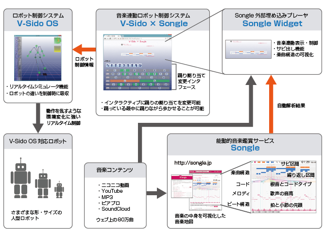 如下图所示,V-Sido x Songle通过互联网链接V-Sido(V-Sido OS)和Songle时控制机器人的舞步。