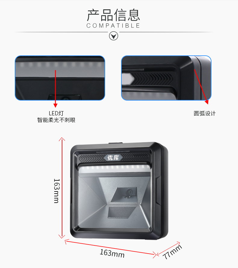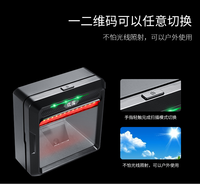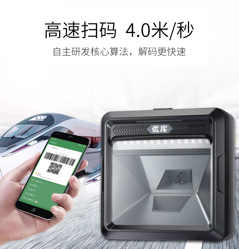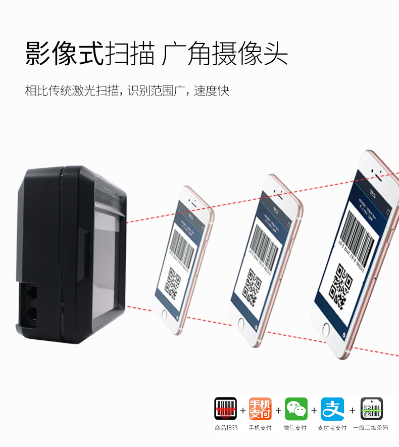 高速工业级二维扫描平台,大窗口任性扫,支持扫描开票,屏幕可扫;影像一二维扫描,COMS影像式,即插即用,蜂鸣提示,防震抗摔,扫码支付,全方向扫描;高速扫描,4.0米/秒,自主研发核心算法,解码更快速;大窗口任性扫,全向免持式扫描,无需手持,解放您的双手,让您 的工作效率更高;一次购买,解决您的全部需求,它在商品线性条码的扫描上拥有一次扫描通过率,同时它还能帮助零售商解决不断增长的数字条码的读取需求,而不需要额外的扫描器;可读取印刷的一维码及数字式一维、屏幕二维码、PDF条码;轻松读取手机屏幕一维、二维码,带给你高效的收银体验;扫描一键开票,自动录入开票无误差,支持zhi fu bao、百旺公众号,国税发票助手APP等,开票平台,兼容增值税发票和普通发票;可扫大大小小条码,码制大小、码制种类、错码、断码、脏码等;影像式扫描,广角摄像头,相比传统激光扫描,识别范围广,速度快;一二维码可以任意切换,不怕光线照射,可以户外使用;自动感应扫描,节能省时,当商品条码经过扫描窗口时中,瞬间唤醒平台读取条码;即插即用,兼容各大系统;适用多种行业,各种场合,商店超市,餐厅甜点,扫描方便快捷。