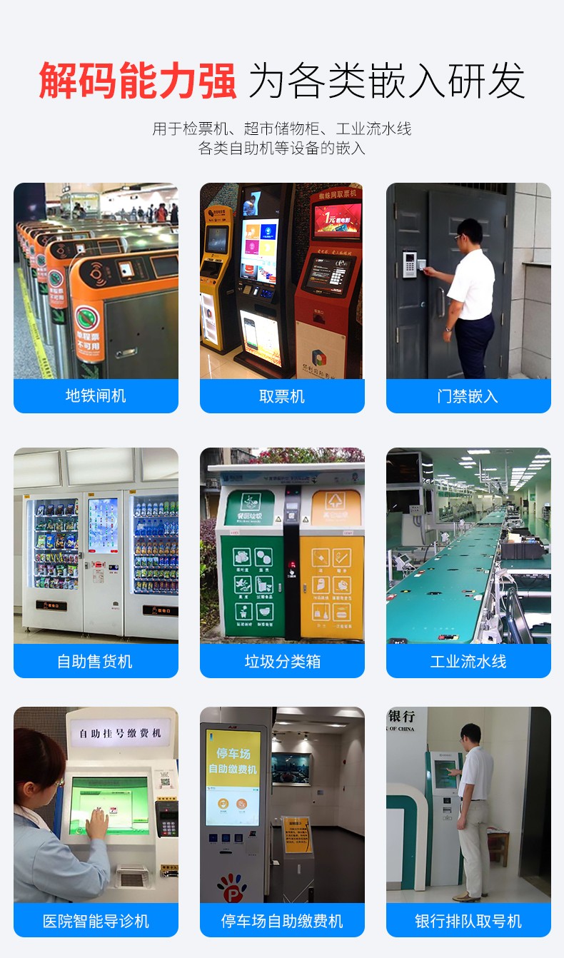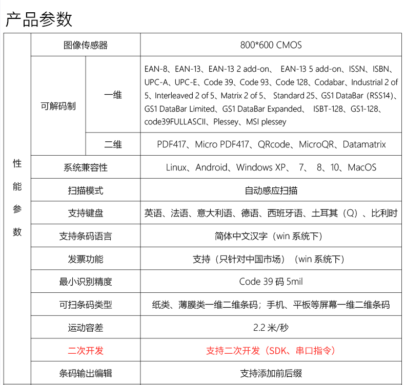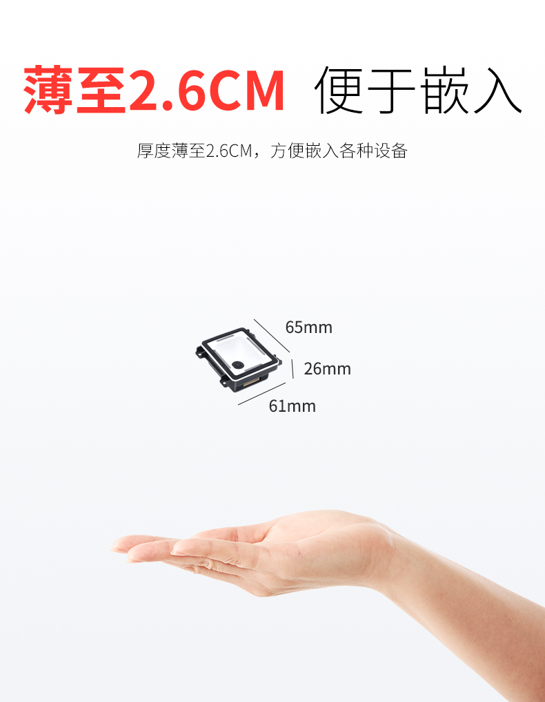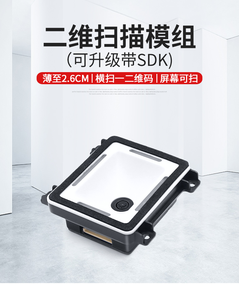 二维扫描模组,可升级带SDK,薄至2.6CM、横扫一二维码、屏幕可扫;CMOS影像,手机支付,一二维码,多种接口;解码能力强,为各类嵌入研发,用于检票机、超市储物柜、工业流水线,各类自助机等设备的嵌入;厚度薄至2.6CM,方便嵌入各种设备;快速扫描,纸质和屏幕条码,优越的性能,能快速识别纸类、薄膜类一维、二维条码,高反光屏幕码、亮度低屏幕码;自动感应,节能省时,当商品条码经过扫描窗口时,可瞬间唤醒平台读取条码;支持二次开发,支持多国语言,支持SDK,串口开发指令齐全,可满足各类主机控制交互需求,支持增加前后缀,支持多国语言,小语种可定制;可在线升级迭代、不能读取条码研发支持,通过Flash Utility软件在线升级;兼容多种系统,便捷使用,多接口技术支持。