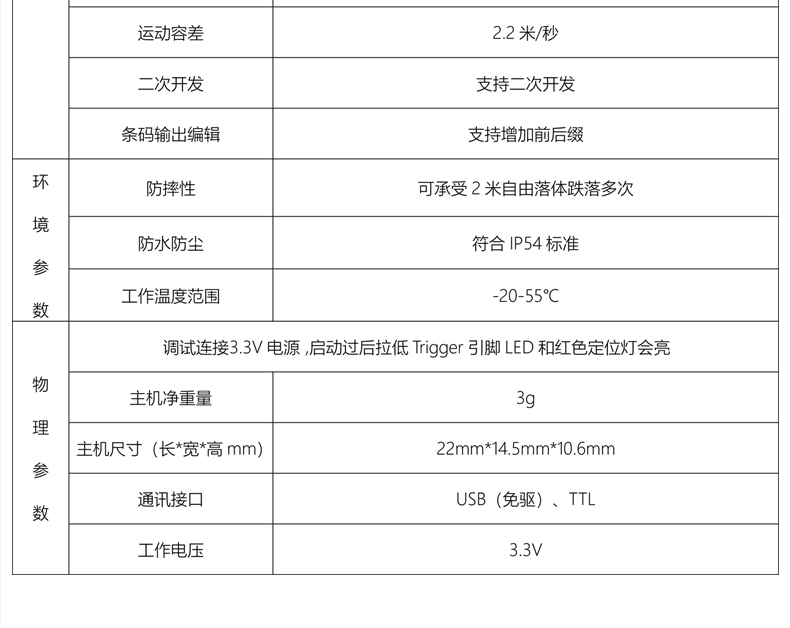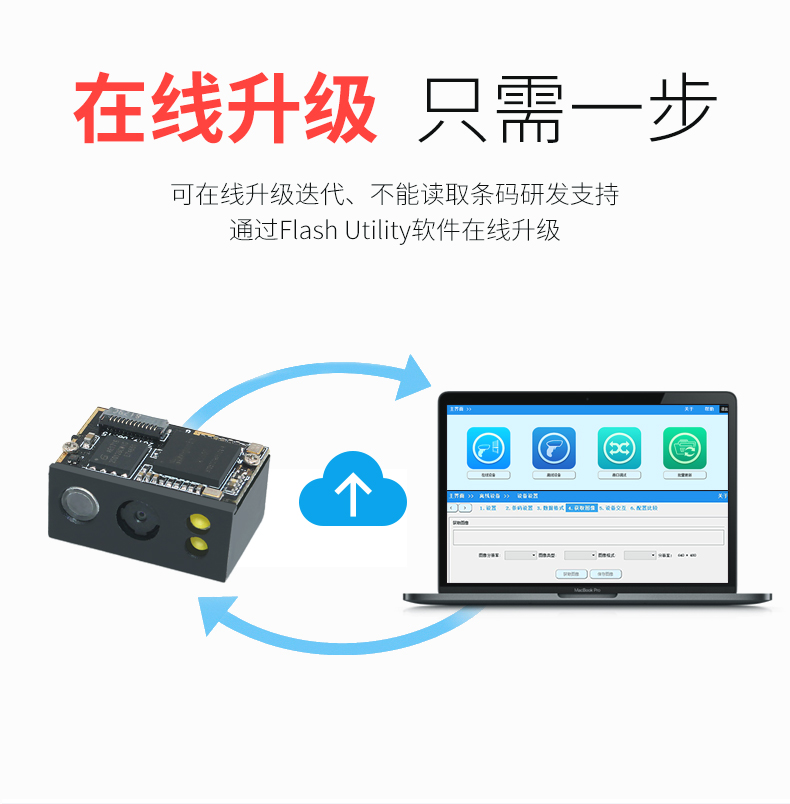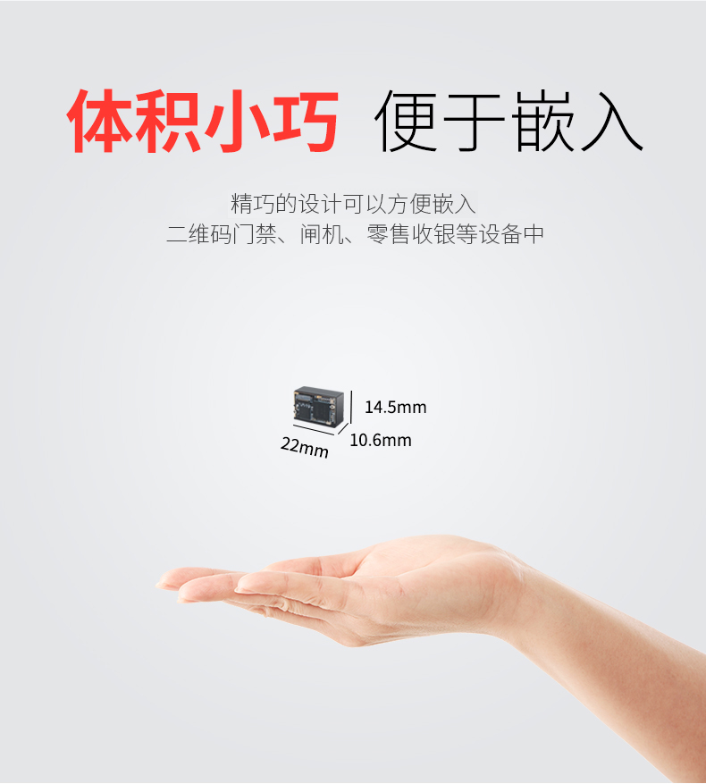 二维扫描引擎,可升级带SDK,即插即用,低功耗高配置、屏幕可扫,CMOS影像;解码能力强,为各类嵌入研发,在极小的尺寸内完全集成图像采集、照明瞄准和解码器,既小右轻,性能强劲。非常适合嵌入各种行业的产品中使用,如数据采集、抄表设备、检票机PDA等;体积小巧,便于嵌入,精巧的设计可以方便嵌入,二维码门禁、闸机、零售收银等设备中;快速扫描,纸质和屏幕条码,优越的性能,能快速识别纸类、薄膜类一维、二维条码,高反光屏幕码、亮度低屏幕码;低功耗高配置,拒绝卡顿;自动感应,节能省时,当商品条码经过扫描窗口时,可瞬间唤醒平台读取条码;支持二次开发,支持多国语言,支持SDK,串口开发指令齐全,可满足各类主机控制交互需求,支持增加前后缀,支持多国语言,小语种可定制;可在线升级迭代、不能读取条码研发支持,通过Flash Utility软件在线升级;兼容各大系统。