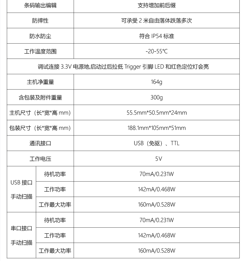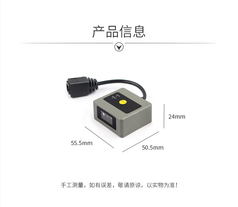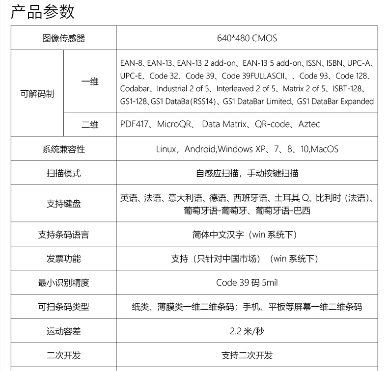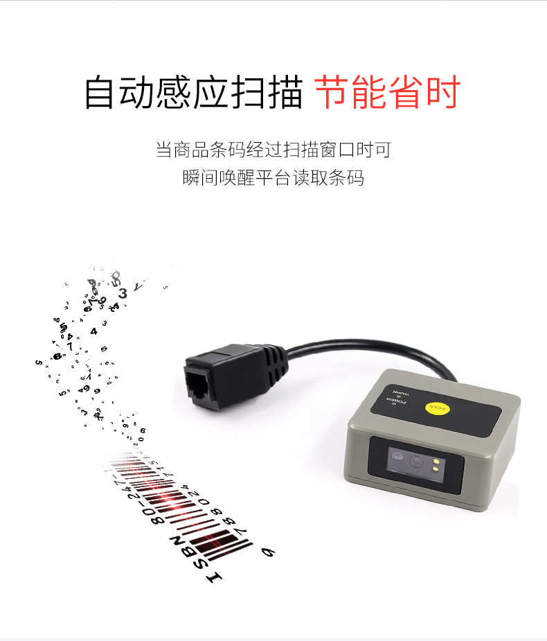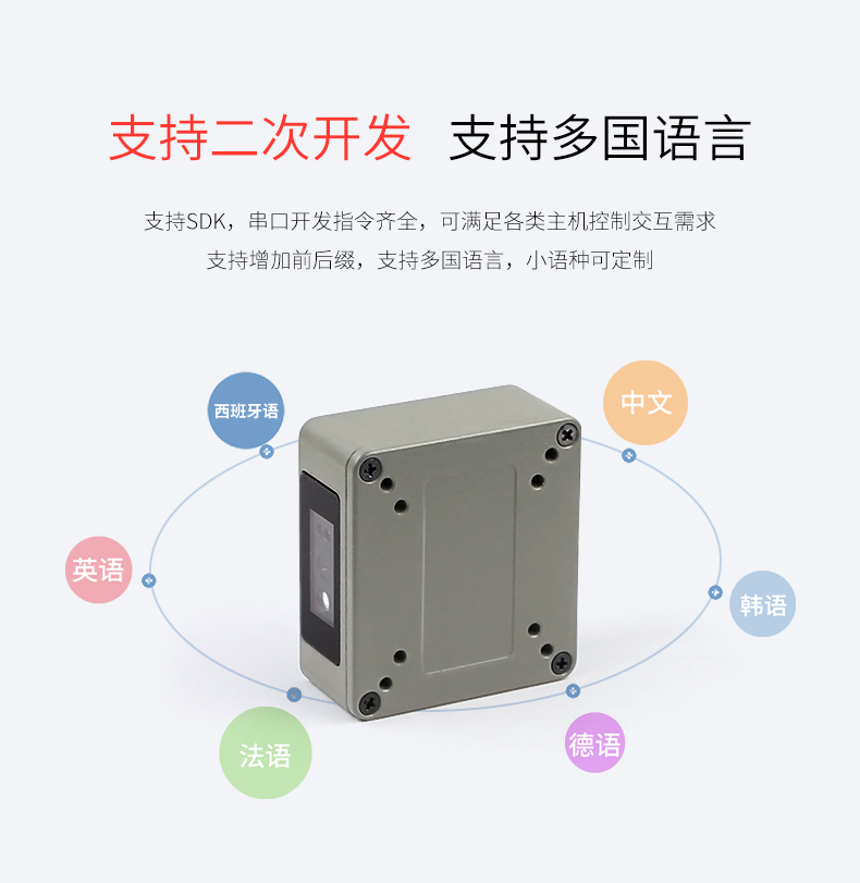EP2300二维扫描模组,可升级带SDK,锌合金外壳,横扫一二维码,屏幕可扫,CMOS影像,多种接口; ,亮度低屏幕码;为各类嵌入研发,用于快速柜、超市储物柜、工业流水线,各类自助机等设备的嵌入;体积小巧,便于嵌入,比同类产品更小,精巧的设计可以方便嵌入,二维码门禁、闸机、零售收银等设备中;自动感应扫描,节能省时,当商品条码经过扫描窗口时,可瞬间唤醒平台读取条码;支持二次开发和多国语言,支持SDK,串口开发指令齐全,可满足各类主机控制交互需求,支持增加前后缀,支持多国语言,小语种可定制;可在线升级迭代、不能读取条码研发支持,通过Flash Utility软件在线升级;兼容各大系统。