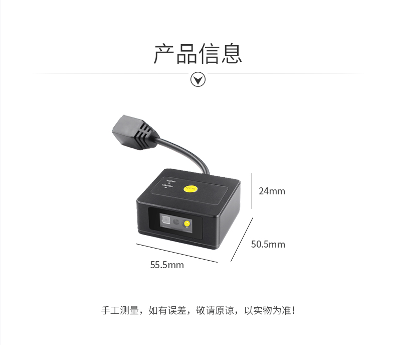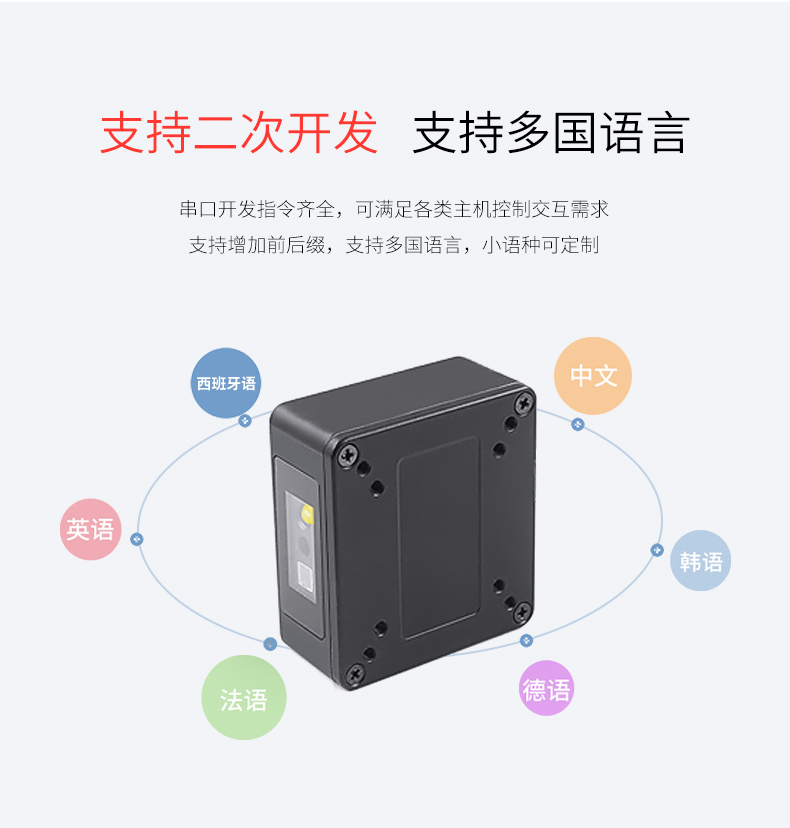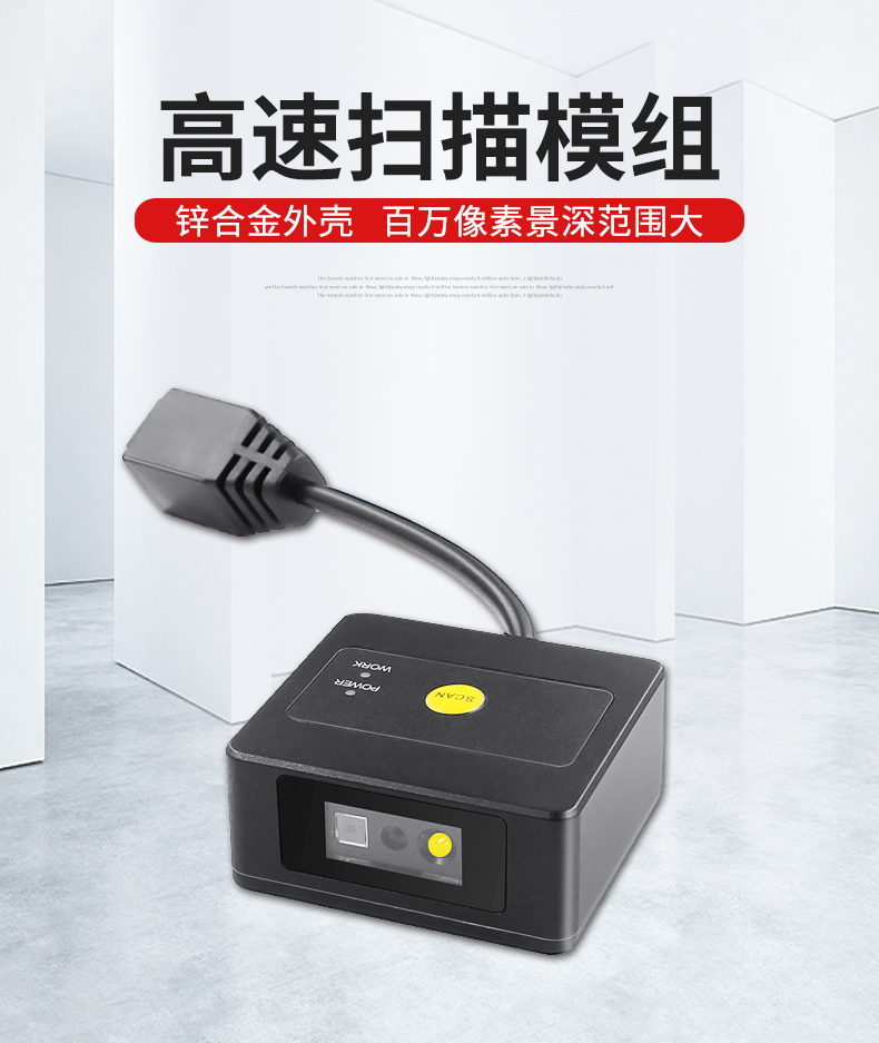 高速扫描模组,锌合金外壳,百万像素景深范围大;CMOS影像,手机支付,一二维码,多种接口;解码能力强,为各类嵌入研发,用于快速柜、超市储物柜、工业流水线,各类自助机等设备的嵌入;体积小巧,便于嵌入,比同类产品更小,精巧的设计可以方便嵌入,二维码门禁、闸机、零售收银等设备中;快速扫描,纸质和屏幕条码,优越的性能,能快速识别纸类、薄膜类一维、二维条码,高反光屏幕码、亮度低屏幕码;自动感应,节能省时,当商品条码经过扫描窗口时,可瞬间唤醒平台读取条码;支持二次开发,支持多国语言,支持SDK,串口开发指令齐全,可满足各类主机控制交互需求,支持增加前后缀,支持多国语言,小语种可定制;即插即用,兼容各大系统。