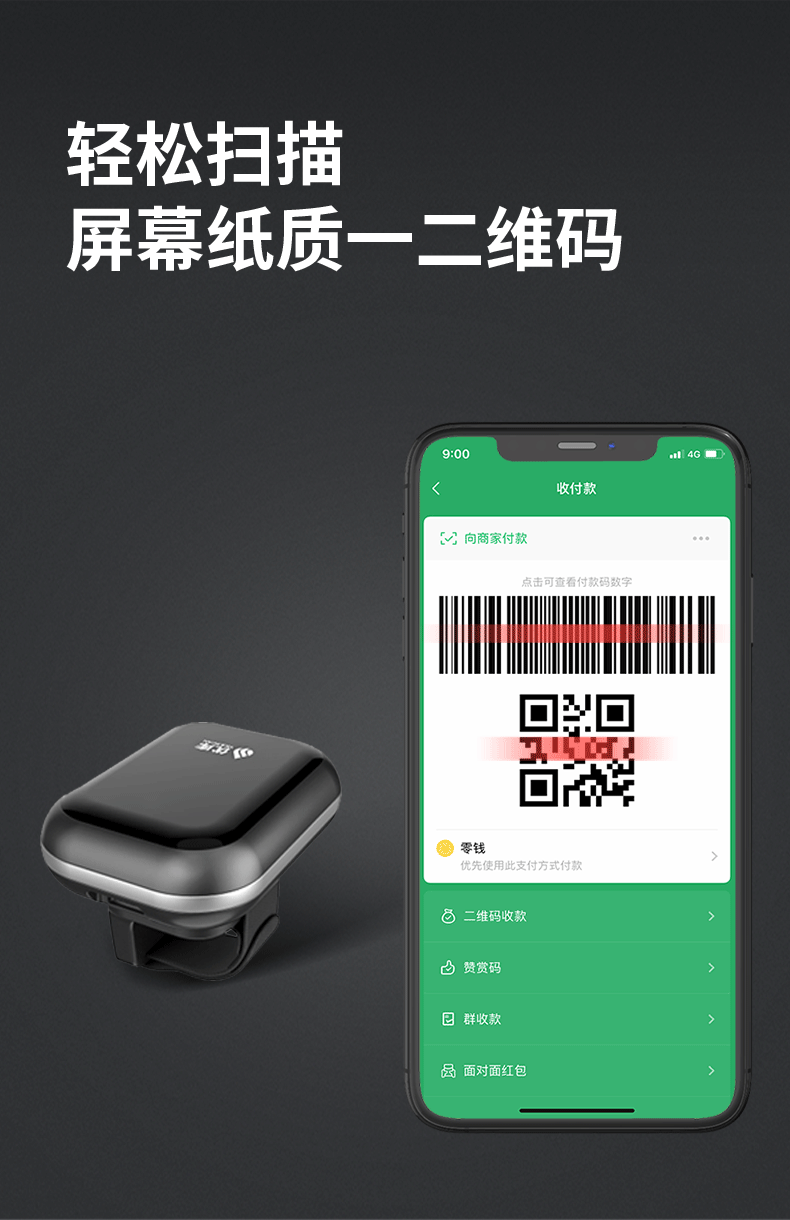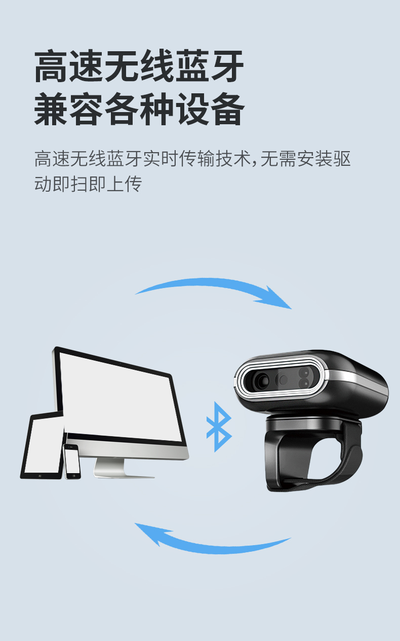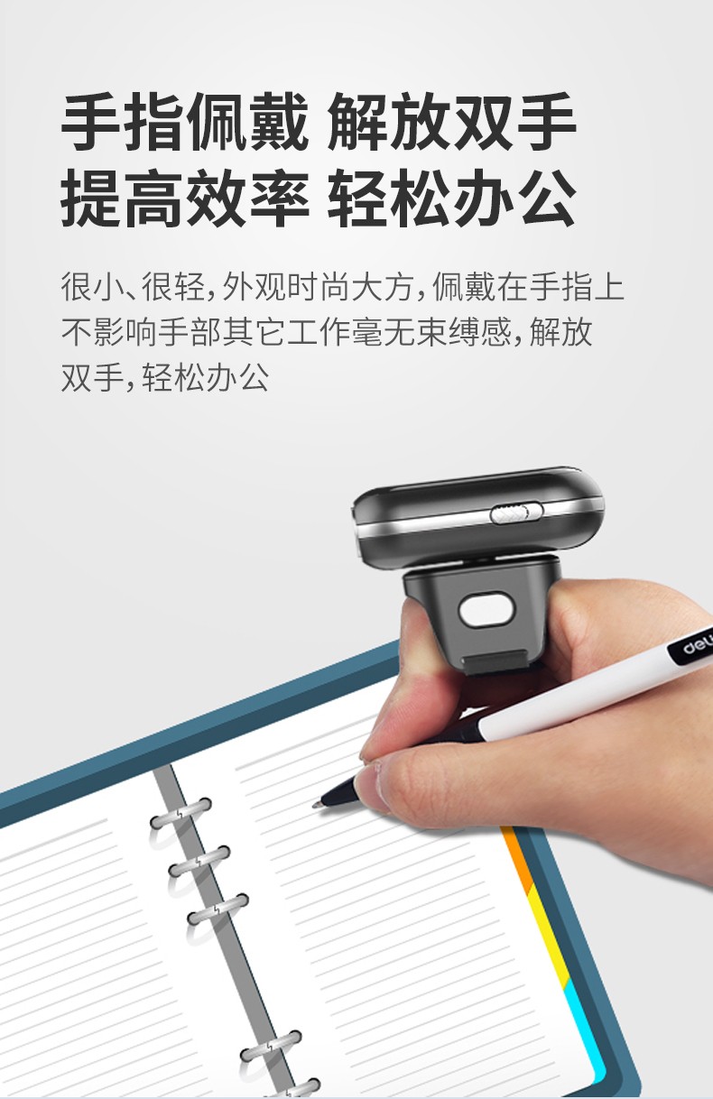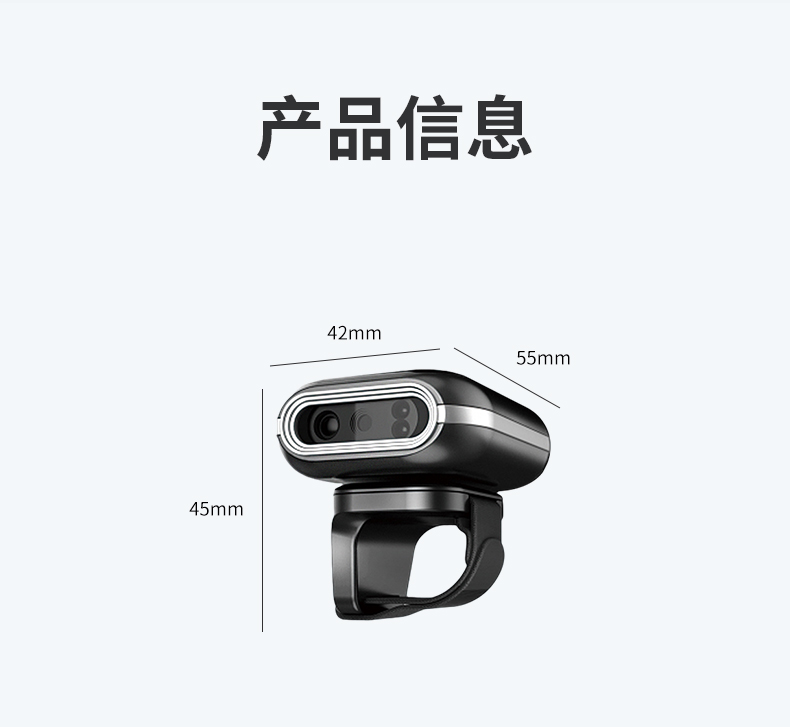 穿戴式指环扫描枪,270°旋转,一二维码,无线蓝牙,离线存储;条码扫描,迷你便携,兼容性强,离线存储,防震抗摔,普通/盘点模式;指环佩戴,解放双手,提高效率,轻松办公;高速无线蓝牙实时传输技术,无需安装驱动,即扫即上传;轻松解决各种条码,优越的性能,能有效识别屏幕纸质一二维码、高反光屏幕码、亮度低屏幕码、模糊码、残损码、彩色码等;小巧轻便灵活,随身携带,扫描头可270°自由旋转,减少扫描局限性,扫码更方便,轻松应对不同扫描场景;大容量品牌电池,低功耗长待机,工作时间长,异步传输,批量存储,脱机大容量,看存储12万条,一次充满电持续扫描一整天;自主研发解码芯片,更快的解码速度,更强读码纠错能力,稳如泰山,扫码就快;广泛适用于各种场景,仓库、商场超市、书店、餐厅、快递物流、服装店,扫描方便快捷。