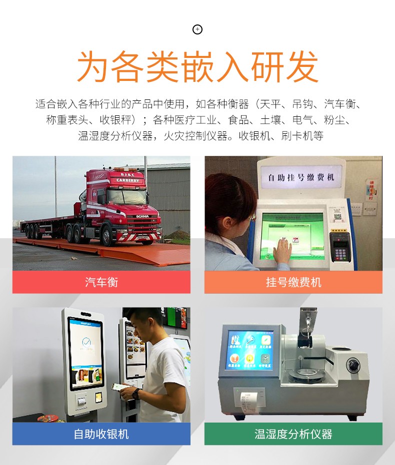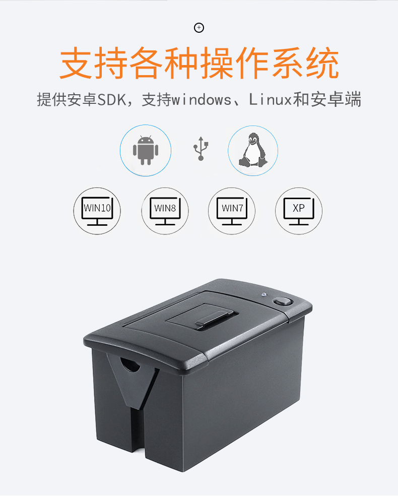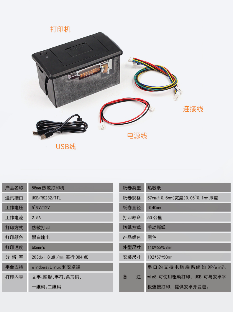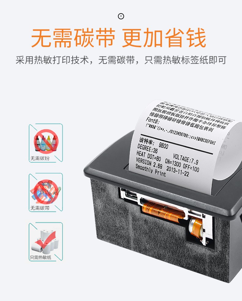 58MM嵌入式票据打印模组,热敏打印免碳带,检测定位精准,一键装纸,支持二次开发(打印指令、SDK);适合嵌入各种行业的产品中使用,如各种衡器(天平、吊钩、汽车衡、称重表头、收银称);各种医疗工业、食品、土壤、电气、粉尘、温度分析仪器,火灾控制仪器,收银机、刷卡机等;支持各种操作系统;打印头耐磨,采用工业级打印头,打印寿命>50公里,确保长时间使用;采用热敏打印技术,无需碳带,只需热敏标签纸即可,更加省钱;品质可靠,经过各种可靠性测试检验标准;多种内容,各国文字、图片、LOGO、二维码均支持打印;省心▪易用,易装纸结构,直接将收银纸面朝下放入即可。