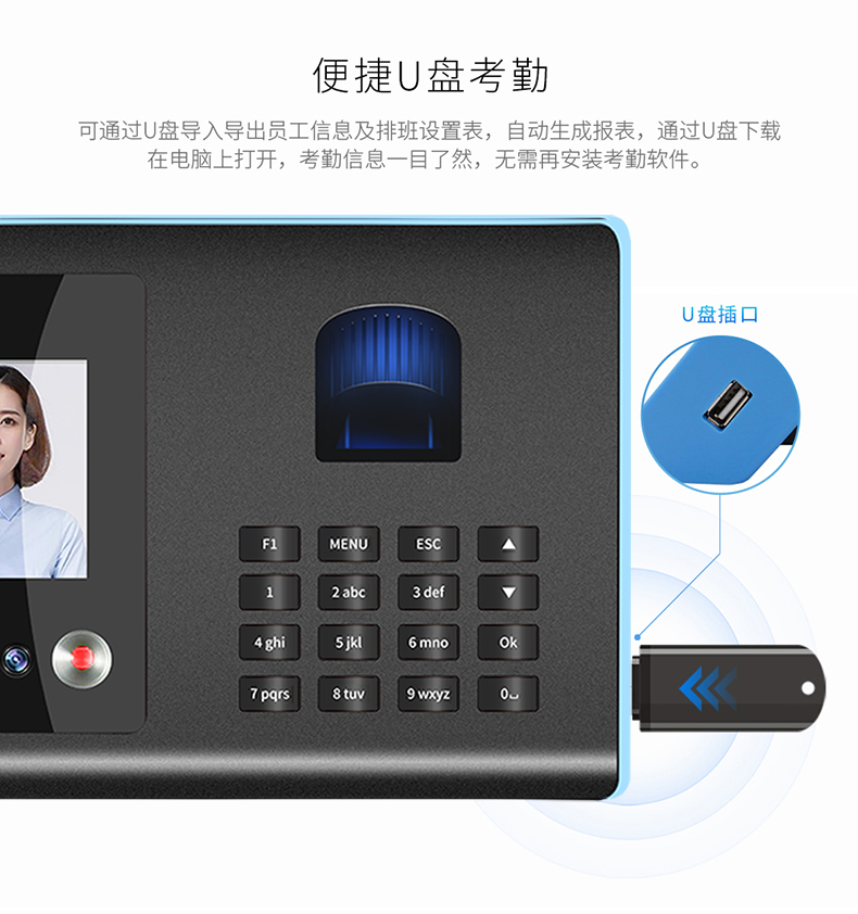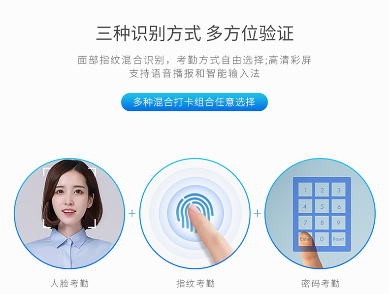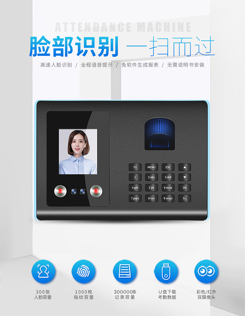 人脸指纹双识别,人脸识别一扫而过,高速人脸识别,全程语音提示,免软件生成报表,无需说明书安装;三种识别方式,多方位验证,面部指纹密码混合识别,考勤方式自由选择,高清彩屏,支持语音播报和智能输入法,多种混合打卡组合任意选;不止快一点,人脸识别快至0.06秒,高精度全反射光学采集器,灯光昏暗也可人脸识别;360°指纹快速识别,360°指纹识别技术,对不同角度的手指都可快速识别;全新升级的新一代芯片,高速32位处理器,高速识别,减少误差;庞大的储存空间,容量升级,新系统稳定可靠,充分的使用体验;全程语音提示,操作清晰明了;便捷U盘考勤,考勤信息一目了然,无需再安装考勤软件。