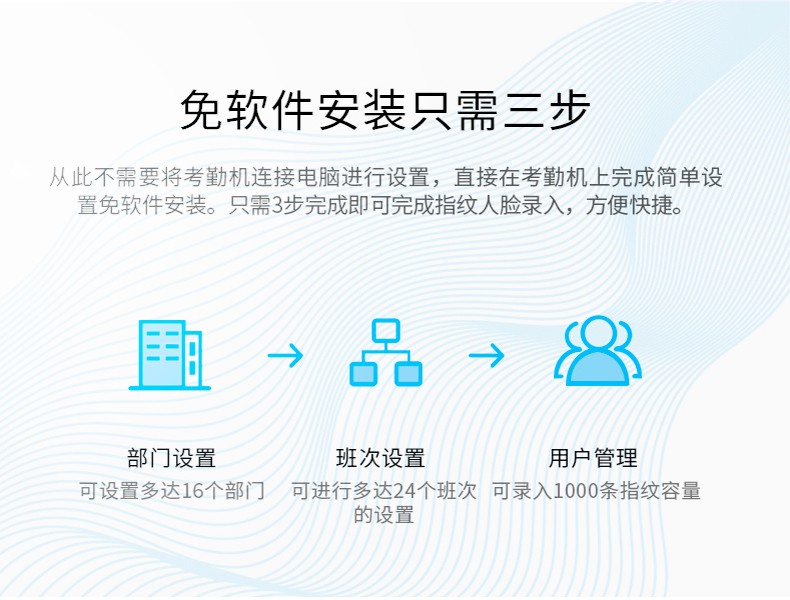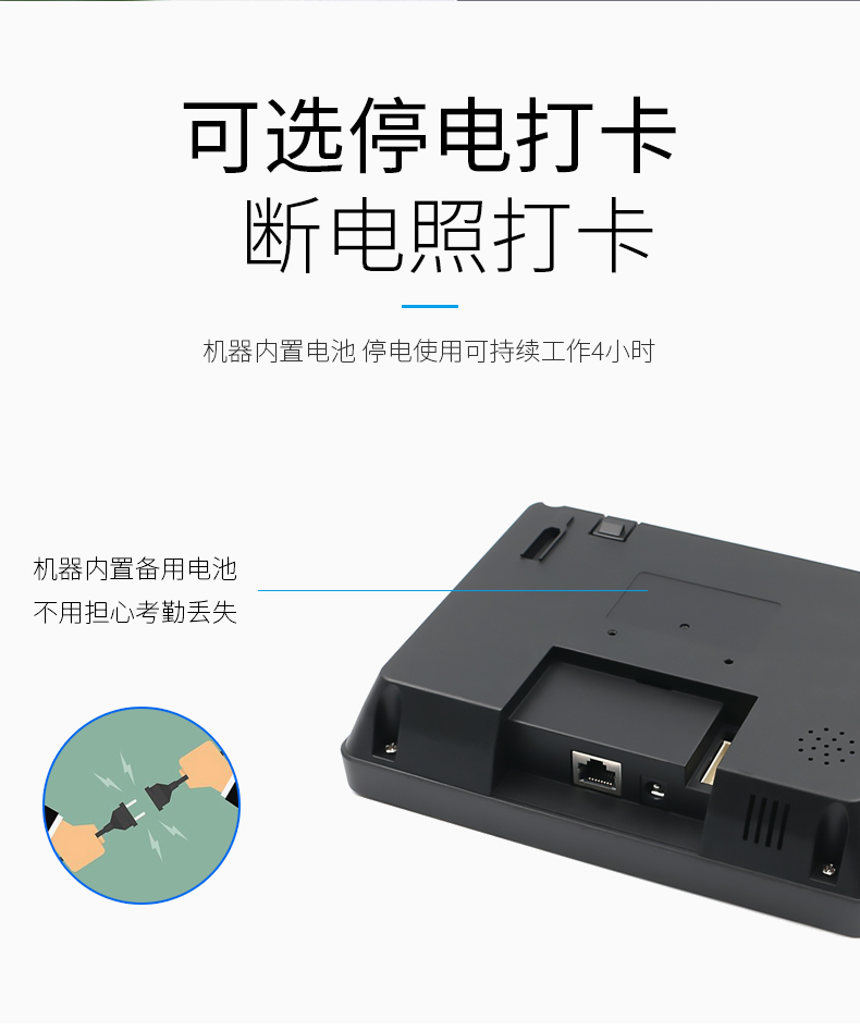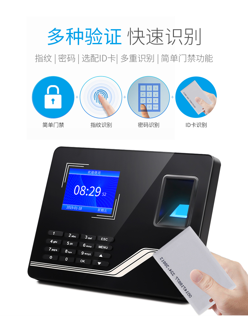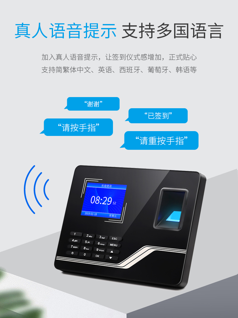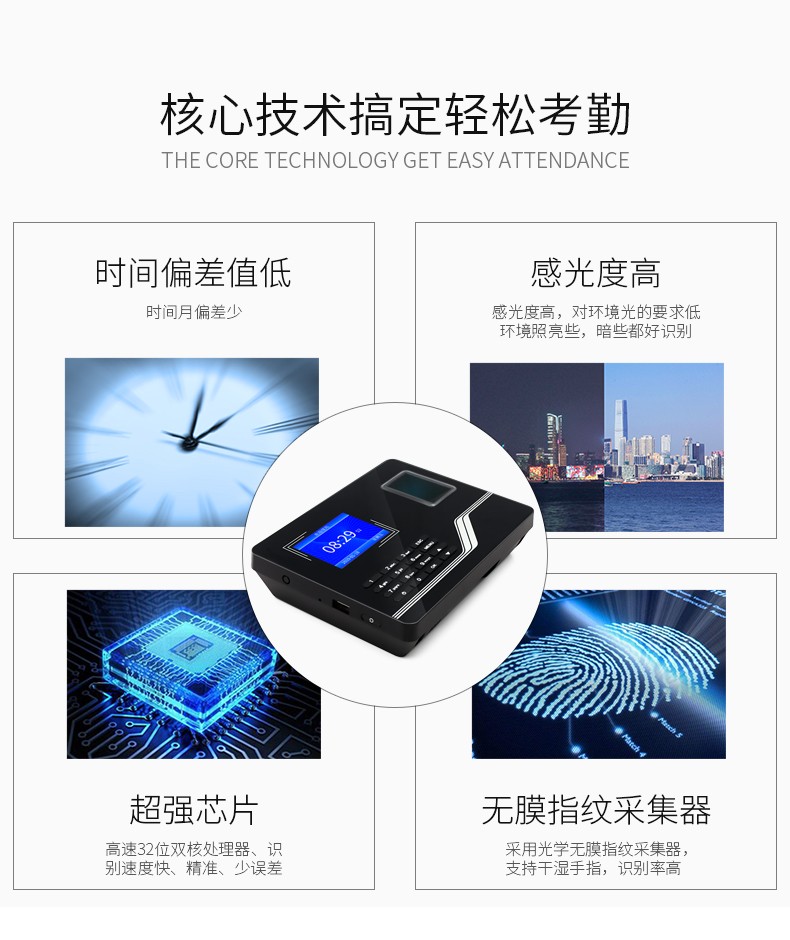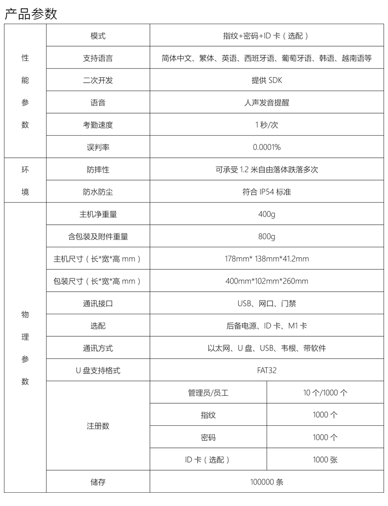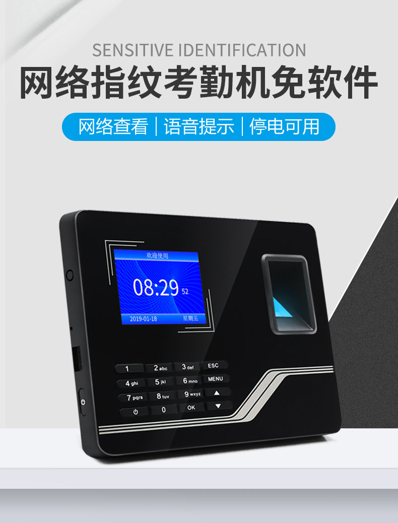 网络指纹考勤机免软件,网络查看,语言提示,停电可用;无膜指纹采集,真人语音功能,快速识别,10万条记录容量,1000枚指纹容量,自动生成报表;免软件安装只需三步,从此不需要将考勤机连接电脑设置,直接在考勤机上完成简单设置,只需三步完成即可完成指纹人脸录入,方便快捷;多种验证,快速识别,指纹,密码,可选ID卡,多重识别,简单门禁功能;核心技术搞定轻松考勤;真人语音提示,让签到仪式感增加,正式贴心,支持多国语言,简繁体中文、英语、西班牙、葡萄牙、韩语;庞大容量,充足使用,大容量升级,系统稳定可靠;可选停电打卡,断电照打卡,机器内置电池,停电使用可持续工作4小时,不用担心考勤丢失;自助报表,多种方式下载,U盘下载,配置标准TCP/IP通讯协议。