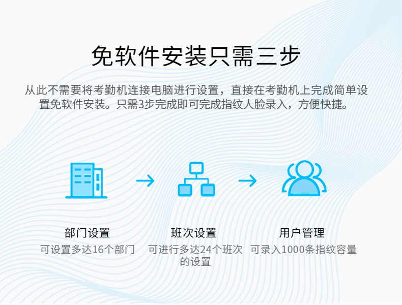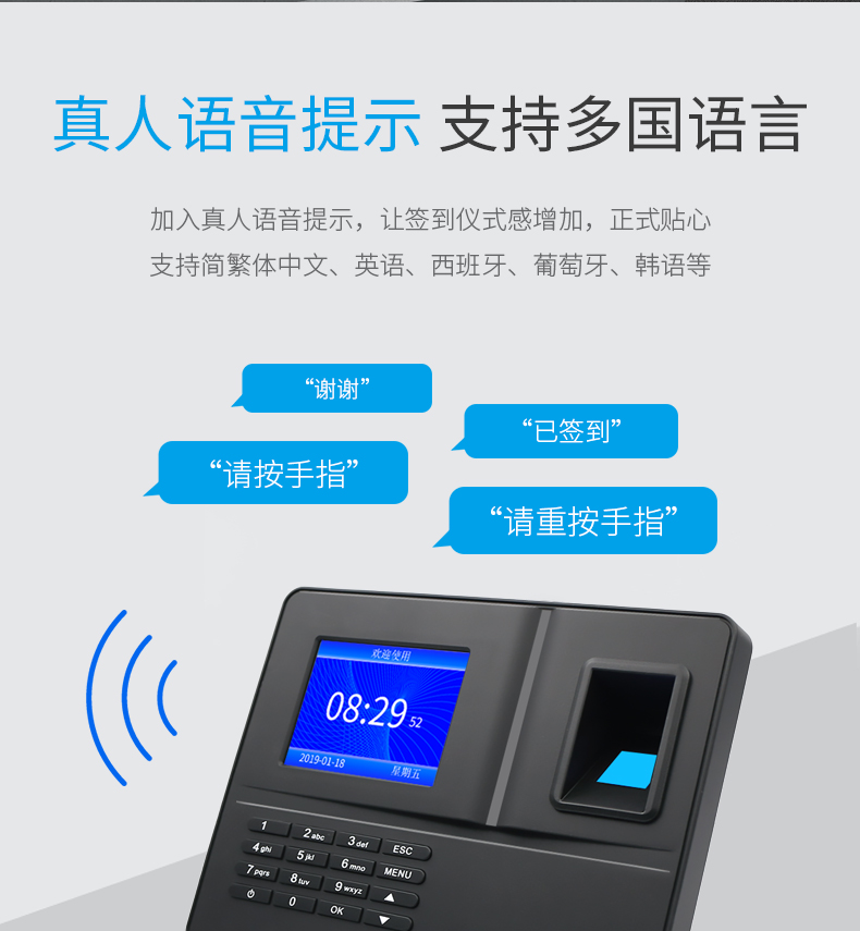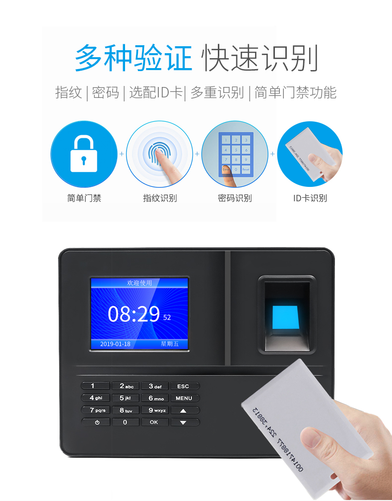 大屏网络指纹考勤机,免软件自动生成报表;无膜指纹采集,真人语音功能,快速识别,10万条记录容量,1000枚指纹容量;免软件安装只需三步,从此不需要将考勤机连接电脑设置,直接在考勤机上完成简单设置,只需三步完成即可完成指纹人脸录入,方便快捷;多种验证,快速识别,指纹,密码,可选ID卡,多重识别,简单门禁功能;核心技术搞定轻松考勤;真人语音提示,让签到仪式感增加,正式贴心,支持多国语言,简繁体中文、英语、西班牙、葡萄牙、韩语;可选停电打卡,断电照打卡,机器内置电池,停电使用可持续4小时,不担心考勤丢失;自助报表,多种方式下载,U盘下载,配置标准TCP/IP通讯协议,可联网查看设置考勤和统计;可设置报表密码,让考勤数据更安全。