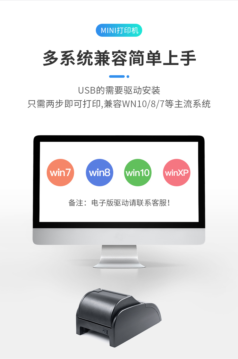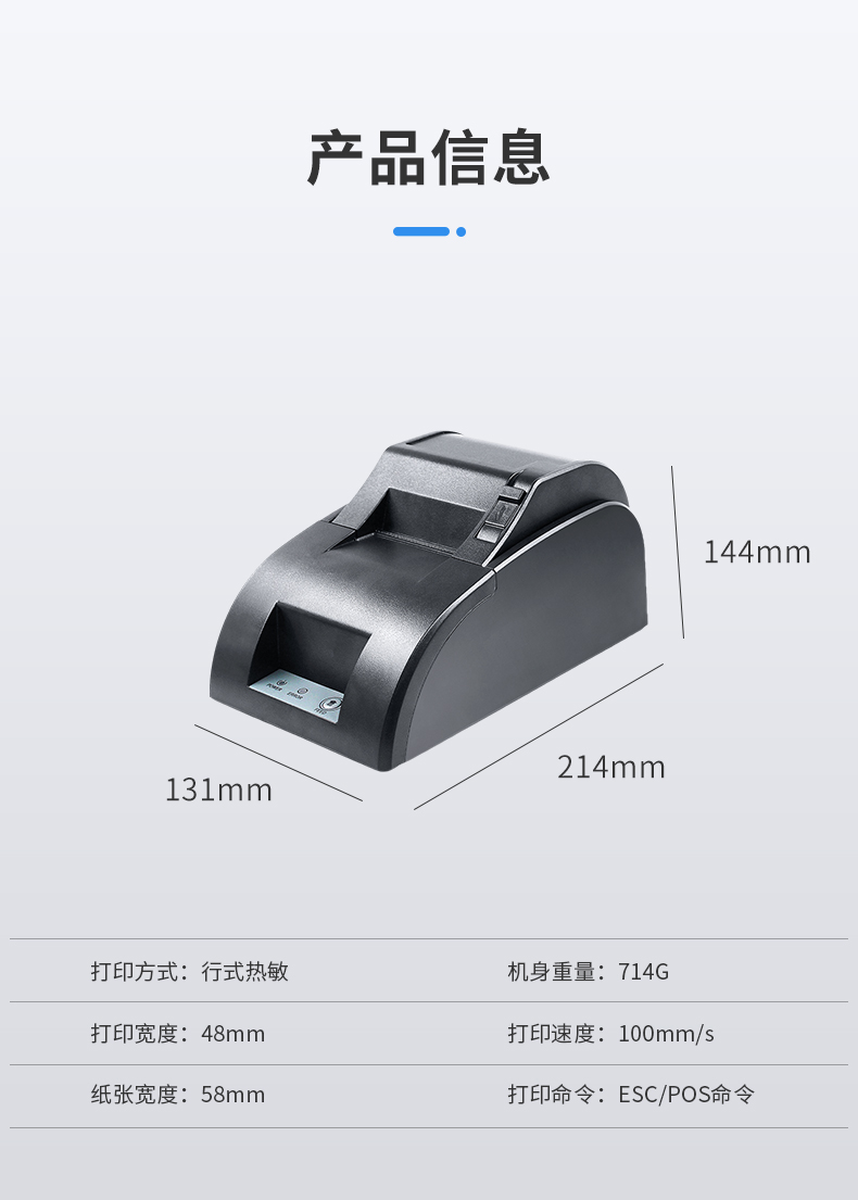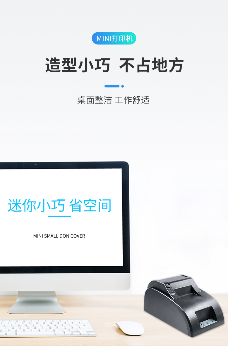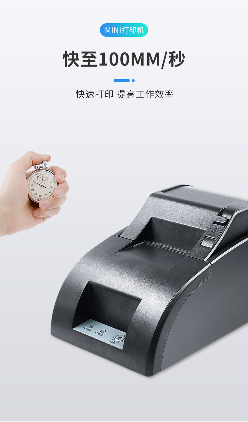 58MM热敏打印机无需碳,体积小,自动接单,电脑无声版,仅电脑连接,支持USB连接;快至100MM/秒,快速打印,提高工作效率;省心易用,易装纸结构,直接将收银纸面朝下放入即可,免墨水,墨带,碳带,省心更省钱;专业耐磨,为打印而生。