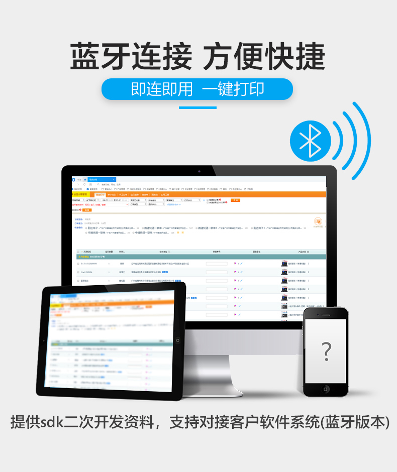 电子面单打印机,为打印量身打造,快递打印我们更专业;小巧机身,智能测纸,打印快速,无纸仓设计,缺纸重打,自动吸纸;快递面单全打印,兼容各类打印软件,兼容市场99%的ERP软件;快至150MM/秒,快速打印,提高工作效率;无需碳带打印,免碳盒、免墨水、免色带;蓝牙连接,方便快捷,即连即用,一键打印,提供sdk二次开发资料,支持对接客户软件系统(蓝牙版本);无纸仓翻盖设计,开盖防尘,防卡纸;打印头坏头问题,一键检测;造型轻小,不占地方,桌面整洁,工作舒适。