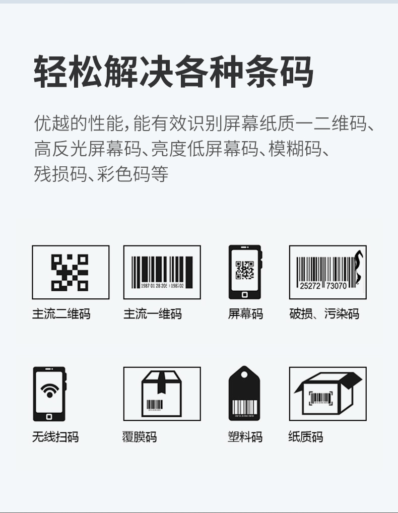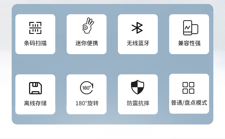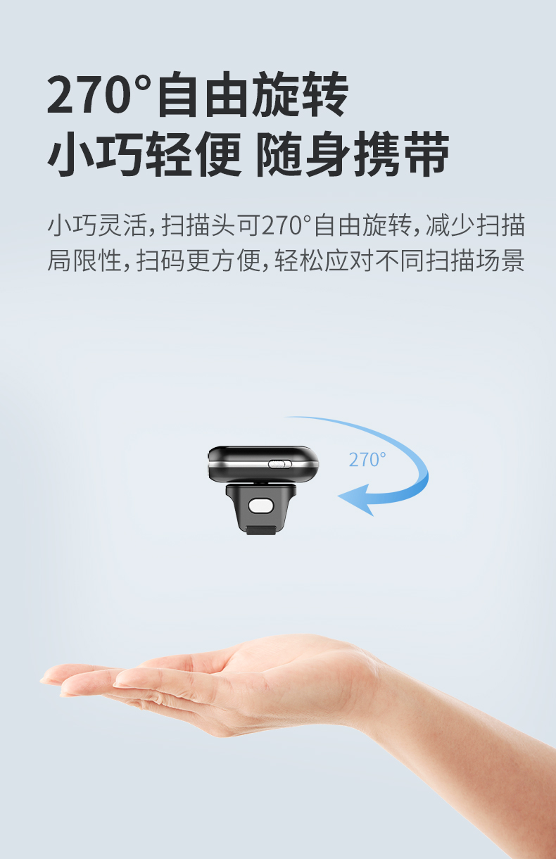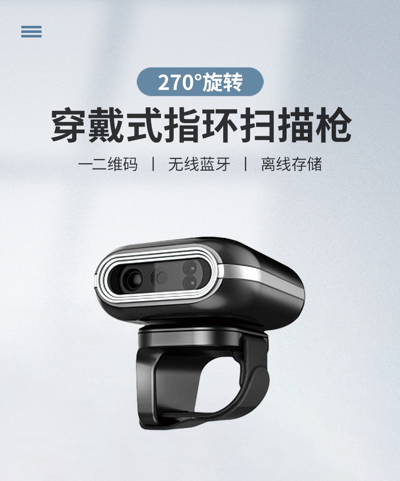 穿戴式指环扫描枪,270°旋转,一二维码,无线蓝牙,离线存储;条码扫描,迷你便携,兼容性强,离线存储,防震抗摔,普通/盘点模式;指环佩戴,解放双手,提高效率,轻松办公;高速无线蓝牙实时传输技术,无需安装驱动,即扫即上传;轻松解决各种条码,优越的性能,能有效识别屏幕纸质一二维码、高反光屏幕码、亮度低屏幕码、模糊码、残损码、彩色码等;小巧轻便灵活,随身携带,扫描头可270°自由旋转,减少扫描局限性,扫码更方便,轻松应对不同扫描场景;大容量品牌电池,低功耗长待机,工作时间长,异步传输,批量存储,脱机大容量,看存储12万条,一次充满电持续扫描一整天;自主研发解码芯片,更快的解码速度,更强读码纠错能力,稳如泰山,扫码就快;广泛适用于各种场景,仓库、商场超市、书店、餐厅、快递物流、服装店,扫描方便快捷。