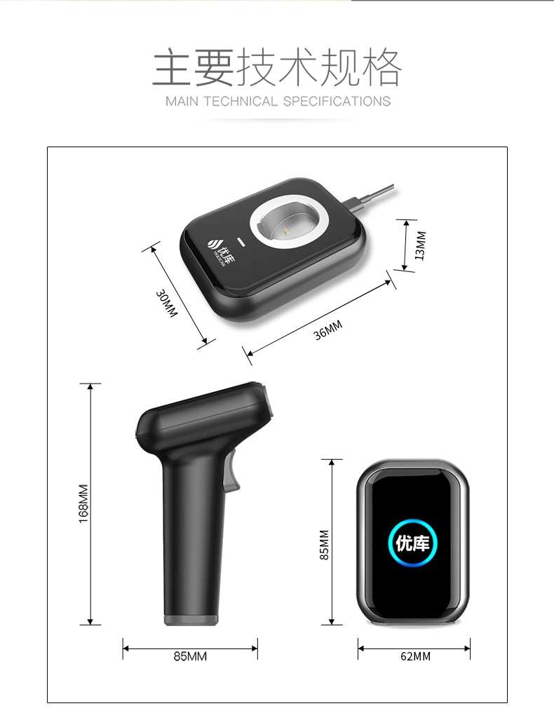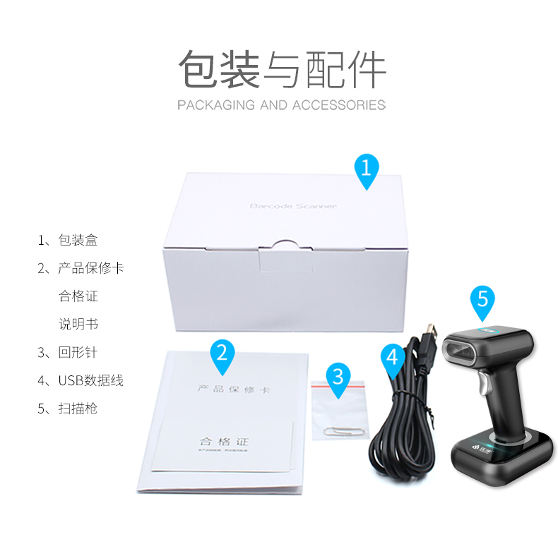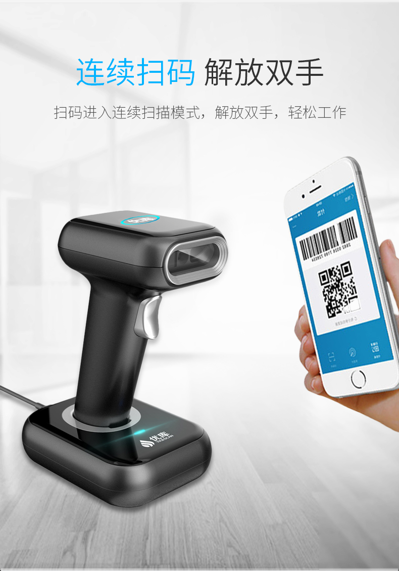 无线二维带充电底座,底座式充电,离线存储,屏幕可扫,无线距离60米;一二维可扫,手机支付,即插即用,无线安装驱动,方便快捷;包教包会,7*12小时原厂专业技术支持,快速迭代;支持在线升级,版本迭代;宽电压设计,解决不稳定的行业难题;告别断电,想用就用,插上底座自动充电,不用再担心断电问题;连续扫码,解放双手,扫码进入连续扫描模式,轻松工作;2.4G高速无线技术,拒绝卡顿,0-60米无线传输距离,兼容各种智能设备;脱机大容量,异步传输,批量存储,可存储12万条;大容量1200MAH锂电池,充电一小时,使用一整天,满电状态下正常使用4天;支持扫描中文二维码,输出中文信息,广泛适用于医药、物流等行业;流畅扫描登机牌上包含多字符的长且高密度PDF417码,洋酒、飞机票、彩票等;有线+无线一枪两用,两种使用模式,使用范围更广泛;精准识别,商品条码;凹凸反光条码,彩色覆膜条码,低亮度屏幕,电子打印标签码;宽电压设计,减少因为供电电压波动影响,使用稳定,拒绝卡顿;兼容多种操作系统,兼容收银软件和进销存软件;条码速度灵敏精确,扫码速度达到2.6m/秒,扫码快人一步;影像白光补光无惧黑夜,大角度远距识别,智能提醒,防止漏扫;自感应扫描,解放双手,只需将条码靠近扫描枪,便可自动唤醒读取,无需进行按键扫描,节能省时。