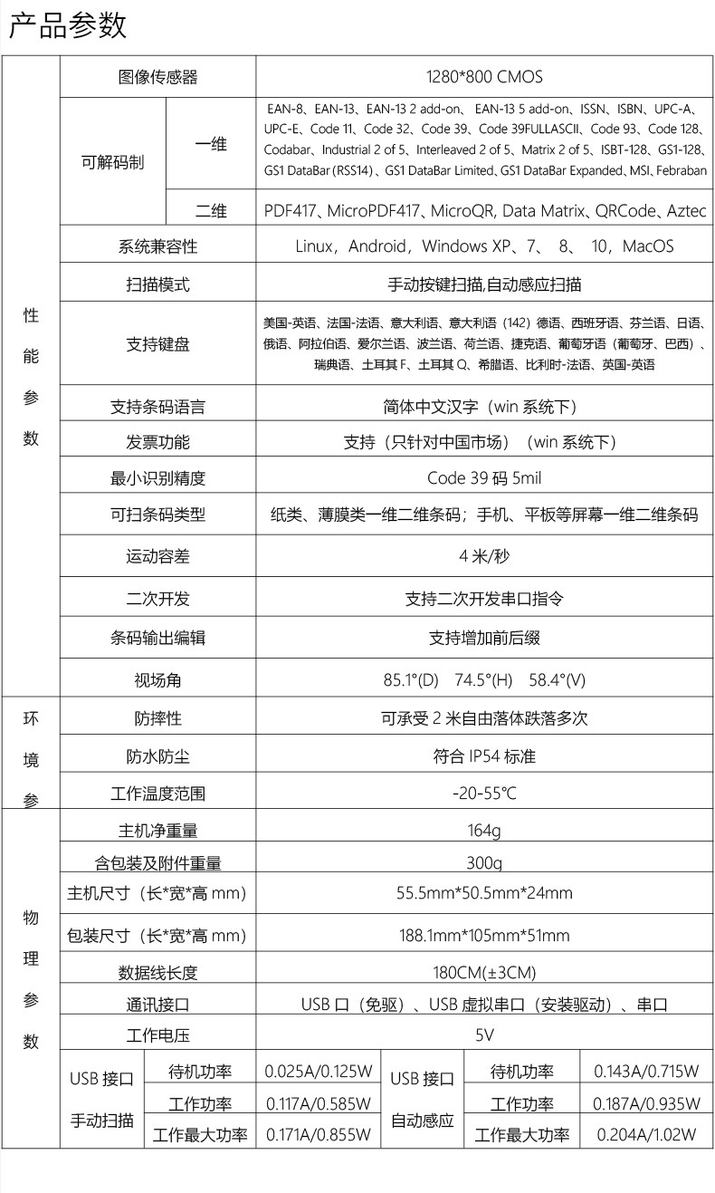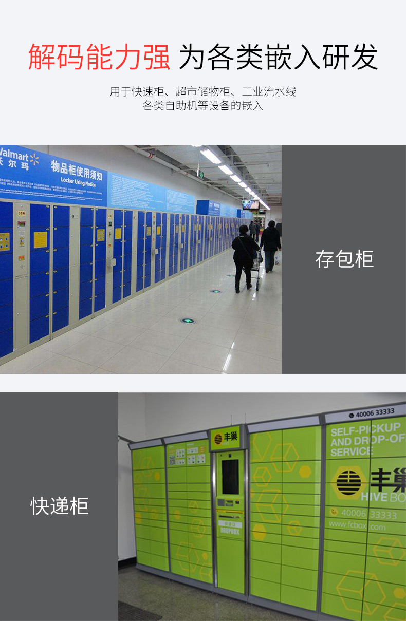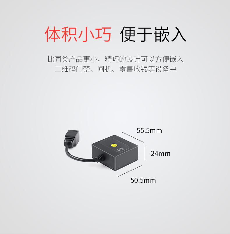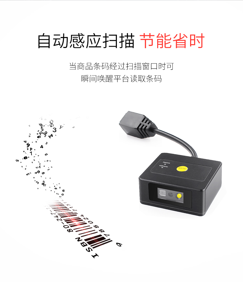 高速扫描模组,锌合金外壳,百万像素景深范围大;CMOS影像,手机支付,一二维码,多种接口;解码能力强,为各类嵌入研发,用于快速柜、超市储物柜、工业流水线,各类自助机等设备的嵌入;体积小巧,便于嵌入,比同类产品更小,精巧的设计可以方便嵌入,二维码门禁、闸机、零售收银等设备中;快速扫描,纸质和屏幕条码,优越的性能,能快速识别纸类、薄膜类一维、二维条码,高反光屏幕码、亮度低屏幕码;自动感应,节能省时,当商品条码经过扫描窗口时,可瞬间唤醒平台读取条码;支持二次开发,支持多国语言,支持SDK,串口开发指令齐全,可满足各类主机控制交互需求,支持增加前后缀,支持多国语言,小语种可定制;即插即用,兼容各大系统。