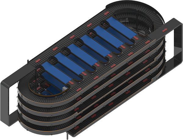 我们的订单管理排序器 (OMS) 是一种高密度排序引擎。由于过程中不需要负载处理托盘,因此简化了传送带技术和控制。