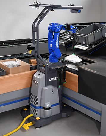 使用 PICK-BY-ROBOT®,可以通过自动输送技术将物品从仓库运送到拣选工作站。LUKE 2 机器人将货物从源容器中取出并放置在一个或多个目标容器/箱子中。高性能相机检测要从源容器中移除的物品。