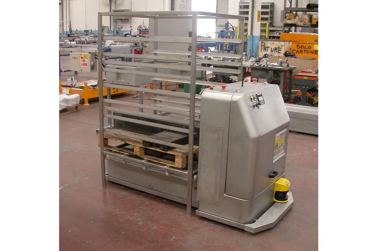 TGV CAMERE BIANCHE能够在生产周期内运送空的或满的手推车,尤其是在洁净室中。它由电池供电,跟随插入地板的永磁体的轨道移动。