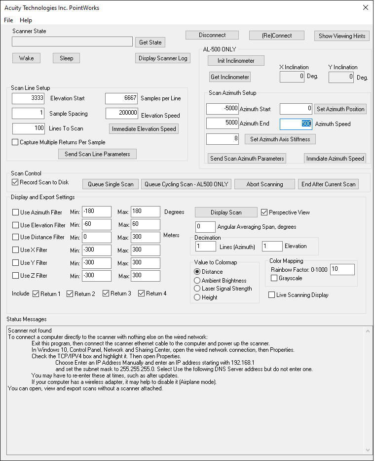 PointWorks 软件包含在 Acuity 的 AL-500 和 AL-500AIR 扫描激光雷达系统中。PointWorks 展示了 AL-500 和 AL-500AIR 的功能,可用于执行扫描、收集和查看点云数据。扫描可以在获取时或收集后显示。PointWorks 还演示了 AL-500 实时应用程序编程接口,并包括一个 Windows 可执行文件和平台独立的 C++ 源代码,用于作为应用程序开发基础的 API。