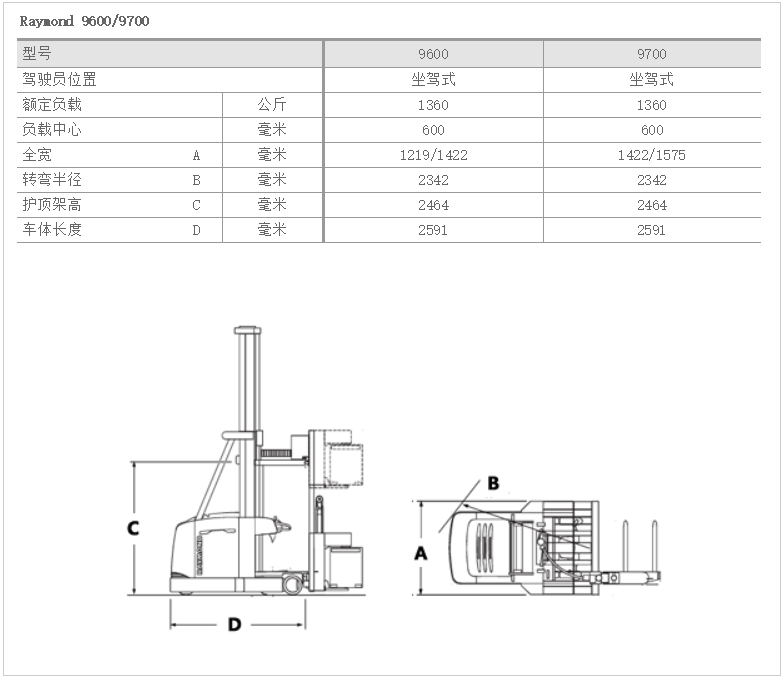 丰田:非常窄巷道车叉车(人上行) Raymond 9600/9700