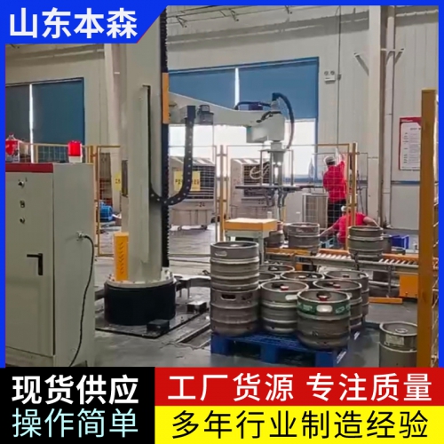 本森扎啤桶立柱码垛机器人是本森智能装备(山东)有限公司研发的一款高效、精准的自动化码垛设备,适用于扎啤桶等圆形桶装物料的码垛作业。以下是对该设备的详细介绍:
