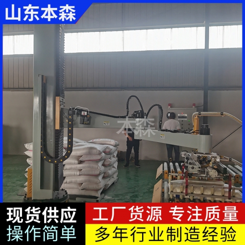 玉米面码垛生产线立柱式堆垛机器人是工业自动化设备的一种,专为物料码垛设计。其核心结构为单立柱支撑机械臂,通过伺服驱动系统控制多轴联动,实现物料从生产线到托盘的精准抓取、搬运与堆叠。该设备可替代人工完成重复性高、劳动强度大的码垛作业,广泛应用于食品、饲料、化工等行业。