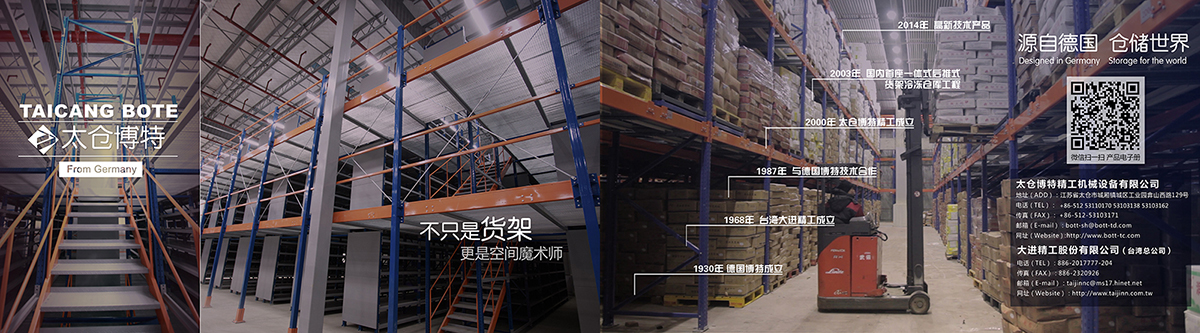 太仓博特精工机械设备有限公司创立于2000年11月2日,在地处有“上海后花园”之称的江苏省太仓市城区工业园购地2.66万平方米。是国内较早专业从事仓储设备研发、生产、销售、安装于一体的大规模企业之一,公司设备齐全,拥有日本进口AMADA数控剪板机、冲床、数控折弯机,台湾研制的数控滚轮一体成型机等先进设备几十套设备,拥有全自动表面喷涂流水线,确保产品高品质。总公司台湾大进精工创立于1968年,1987年与德国博特(Bott GmbH&Co. KG)合作,生产工业用重型工具柜。太仓博特1992年代理德国Hanel公司自动仓储机,1999年与德国Mauser公司合作生产移动柜。博特的产品包括各式仓储与物流设备,在仓储设备领域具有多元化品项且享有极高的声誉,客户群涵盖各大企业集团。经过14年在仓储物流行业的深耕与发展,公司秉持德国工业品质,从主推工位器具转型高新技术自动化货架。2015年太仓博特的市场目标其实非常清晰:即围绕申请成功的两大高新技术产品 ①高空间利用率的后推式货架②物流仓储用电动密集柜 进行市场推广。同时,公司将自动立体仓库、电商阁楼式货架做为升级换代的主打项目进行市场的辐射。新投入的两条进口滚轮成型机也已调试成功,为2015年增添强大的动力。