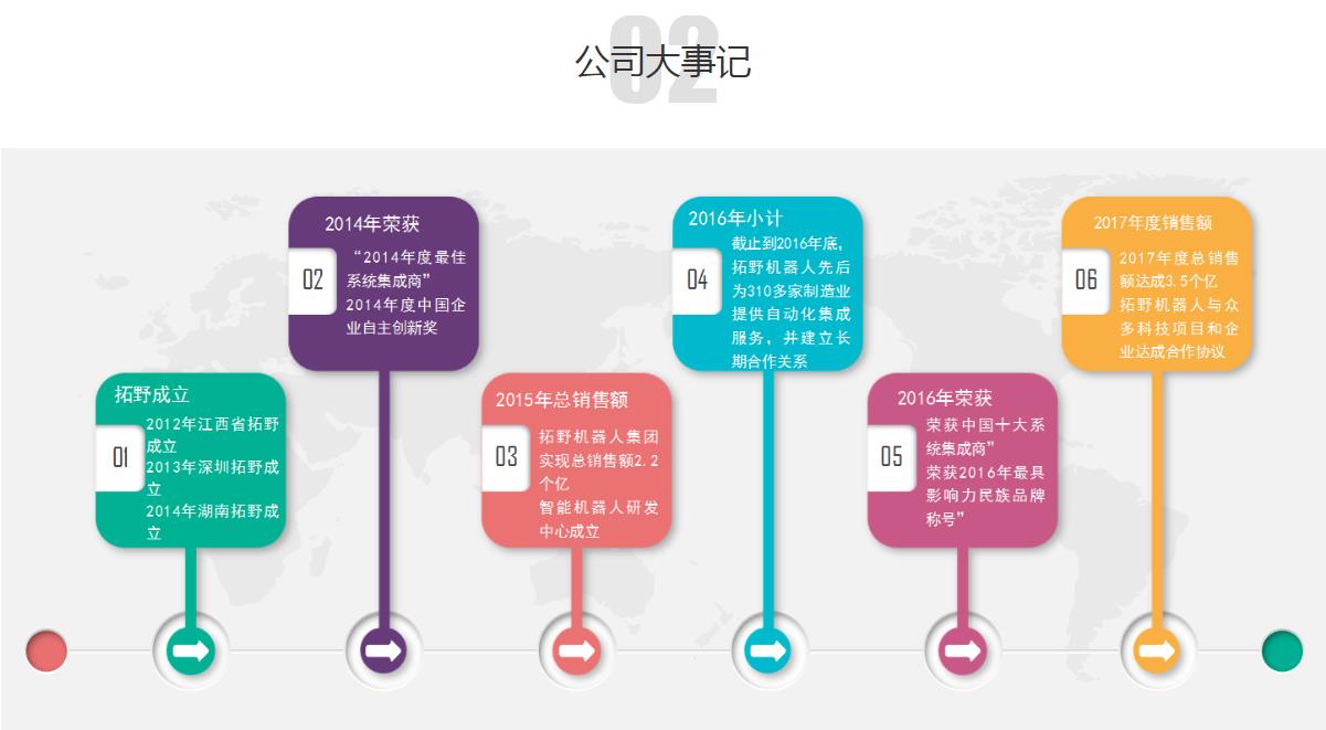 拓野机器人2016年及2018年连续三年被《恰佩克奖委会》评为中国十大自动化系统集成商之一。公司2016年已通过ISO9001质量管理体系认证。 2016年,拓野机器人引入中兴通讯作为战略投资商,从此进入企业健康及快速的发展阶段。