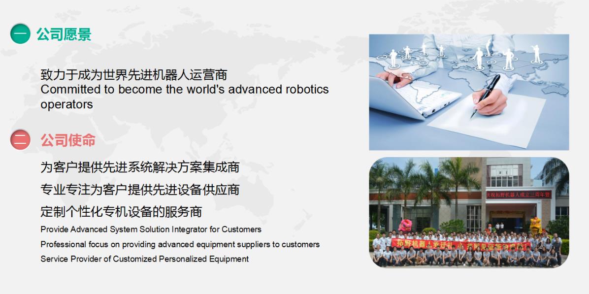 深圳市拓野机器人自动化有限公司(TSIC)成立于2013年,是一家专业从事工业机器人及自动化系统的研发、生产及技术服务的国家高新技术企业。自创办以来,在工厂智能制造、智能仓储物流等领域,取得了一系列骄人业绩和丰硕成果。公司注册资金3885.3余万元,深圳总部厂房及办公面积21000平方米,设有6大营业模块,目前拥有各类自动化工程师200多人,在多个领域成功为客户提供了优秀的自动化解决方案。