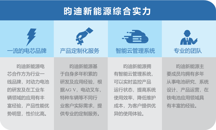 昀迪新能源科技(苏州)有限公司专注于电动叉车、AGV、工业车辆的新能源电池系统的研发、生产、销售及租赁;并能提供锂电池、电机、电控等整套电气系统解决方案。