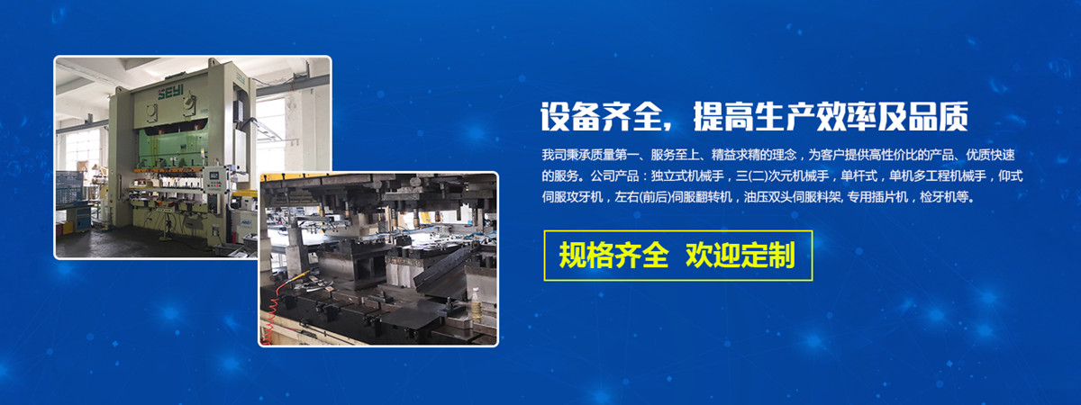 公司产品:独立式机械手,三(二)次元机械手,单杆式,单机多工程机械手,仰式伺服攻牙机,左右(前后)伺服翻转机,油压双头伺服料架, 专用插片机,检牙机等。