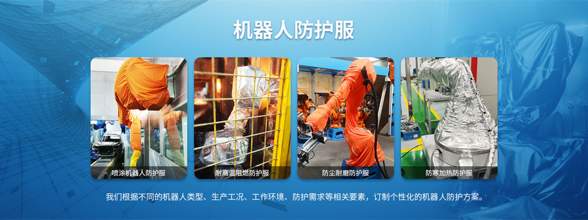 示教器防护服、夹具防护服、非标机器人防护服、焊枪防护服、防静电防爆机器人防护服、耐高温阻燃防护服、防尘机器人防护服、防水清洗机器人防护服、恒温机器人防护服、管线包等。