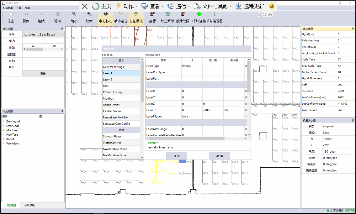 1、无反光板激光导航系统 2、地图编辑软件 3、客户端调度系统 4、中央调度系统 5、导航激光 6、系统主机 7、驱动控制器 8、使用说明书和技术指导