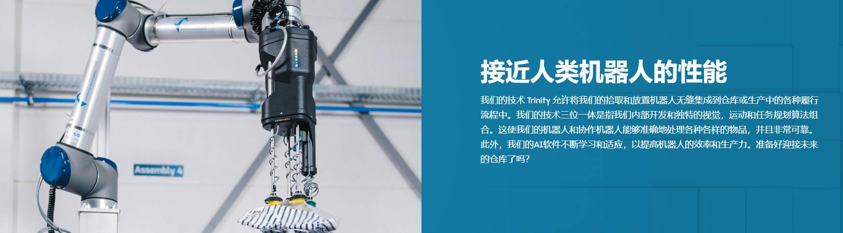 我们的创新机器人和协作机器人可以通过接管重复和体力劳动的任务(如码垛、物品拣选和包裹卸载)来帮助克服不断增长的劳动力短缺并扩大生产规模。得益于我们独特而先进的人工智能软件和技术 Trinity,无需对现有系统和流程进行重大更改,即可提高运营效率和准确性。